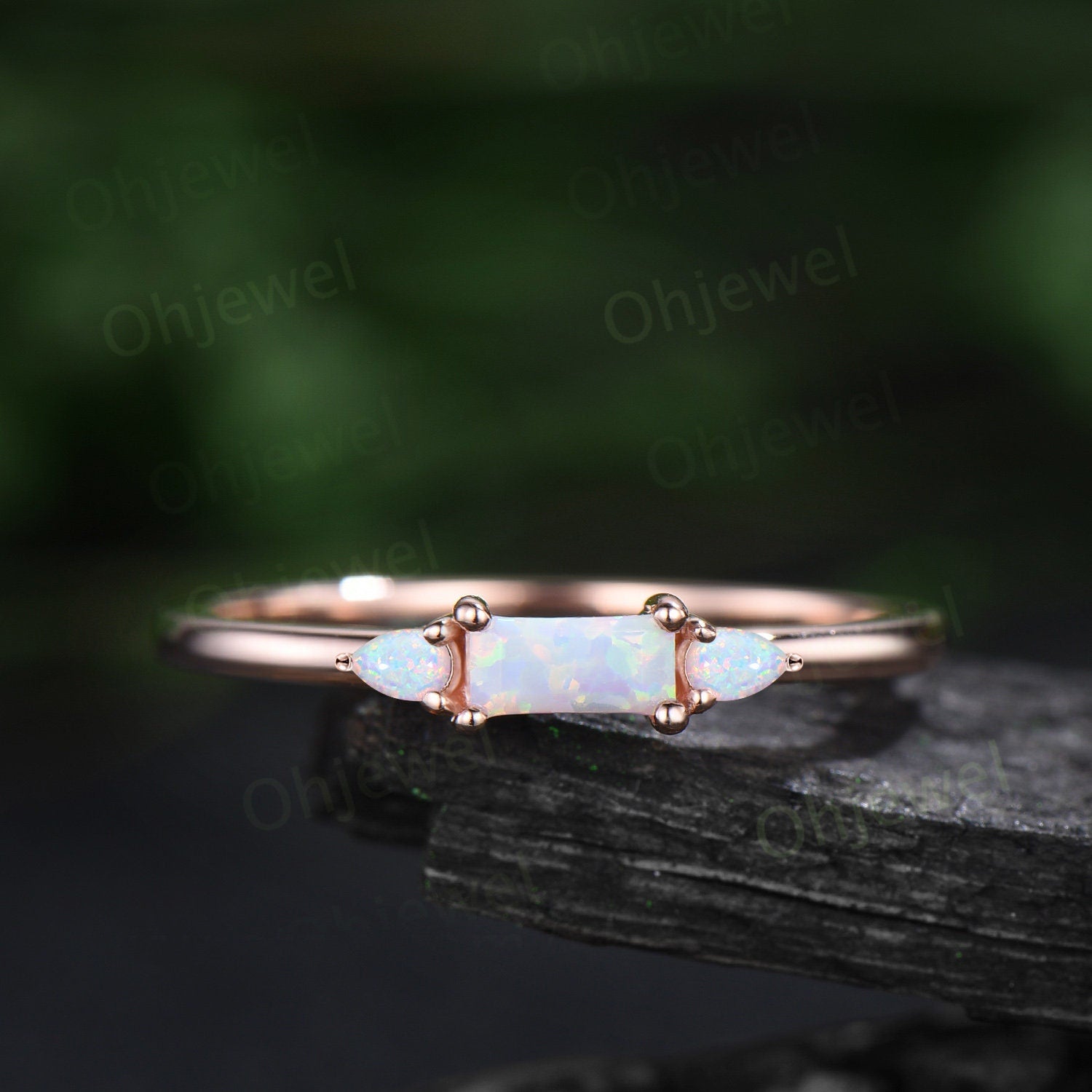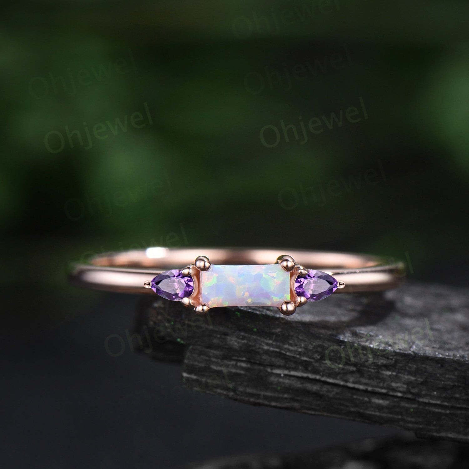 Dainty Baguette cut white opal ring vintage three stone pear amethyst ring 14k rose gold unique engagement ring women anniversary ring gift
