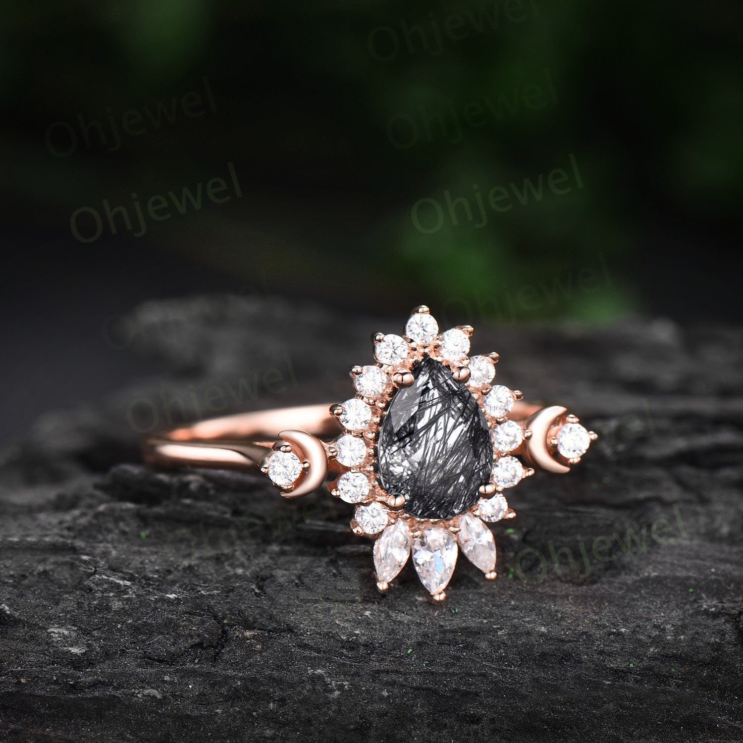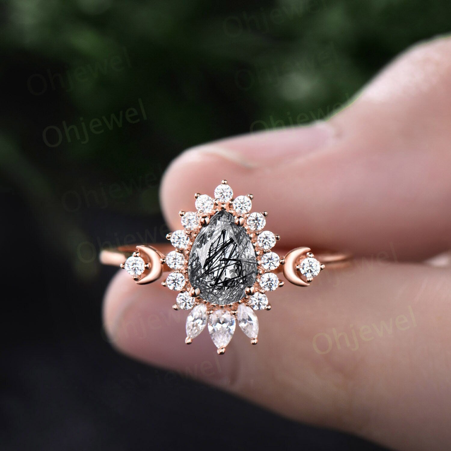 Dainty pear shaped black rutilated quartz ring unique engagement ring rose gold vintage style ring halo moissanite anniversary ring women