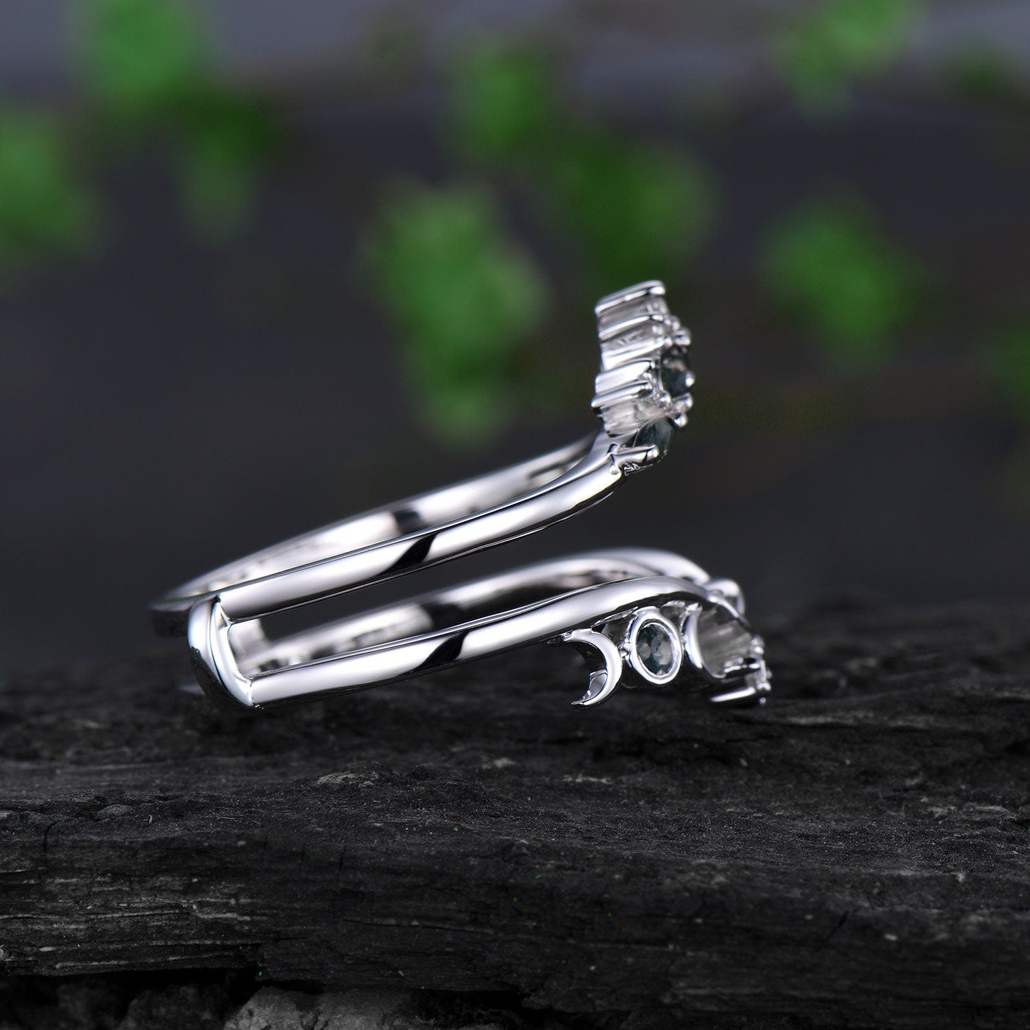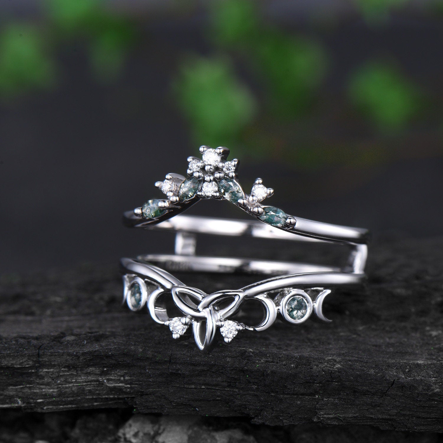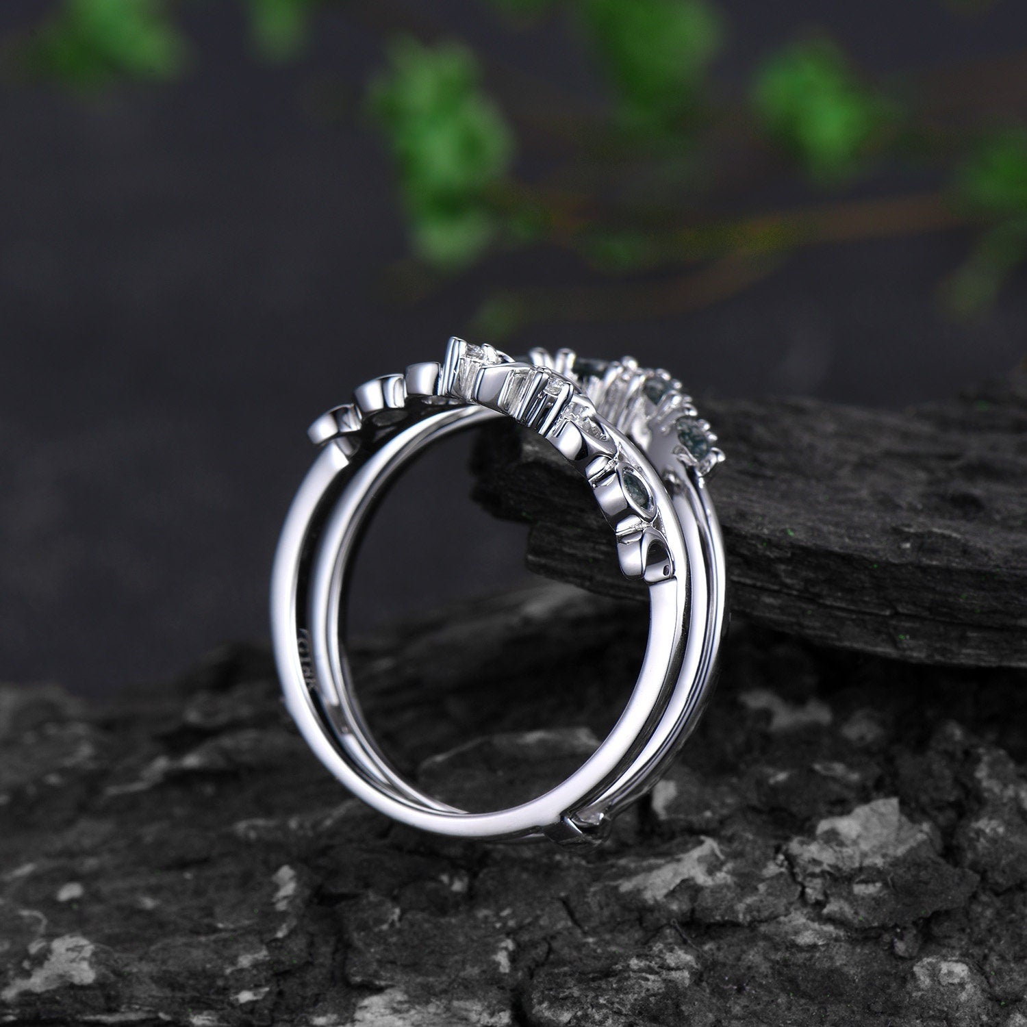 Double curved moss agate wedding band enhancer white gold moon cluster diamond wedding ring band women vintage anniversary gift