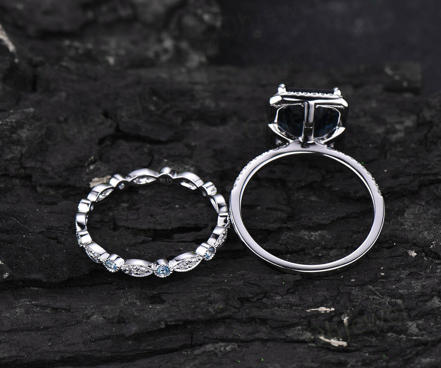 Emerald cut London blue topaz engagement ring set white gold ring moissanite halo ring full eternity topaz wedding band promise ring set