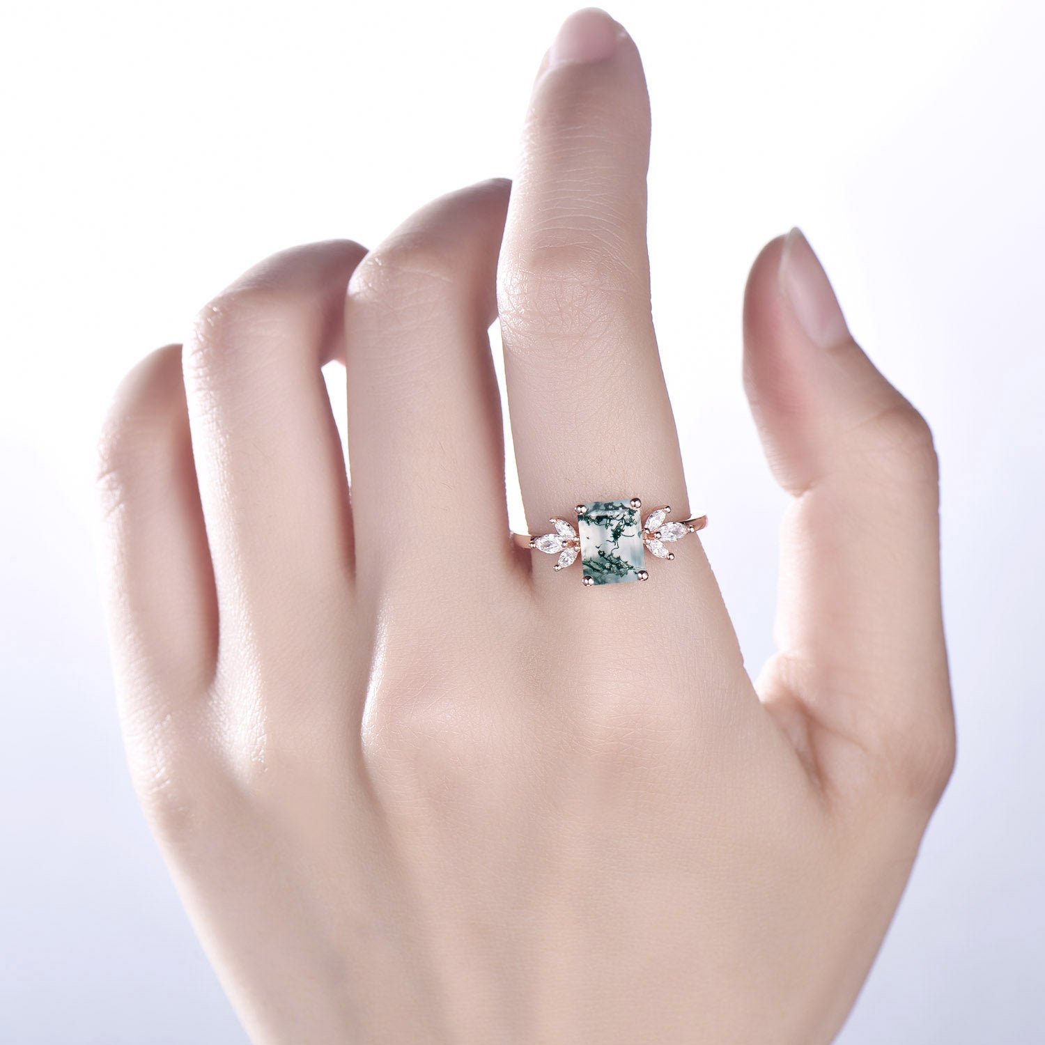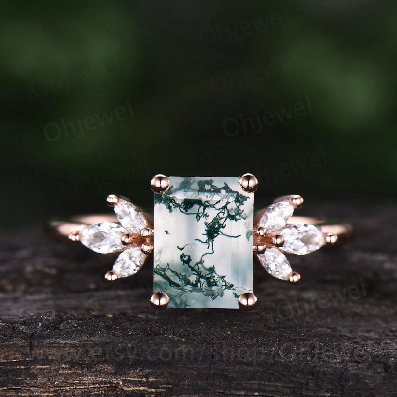 Emerald cut moss agate engagement ring vintage cluster moss agate ring rose gold 7 stone ring marquise moissanite ring unique bridal ring