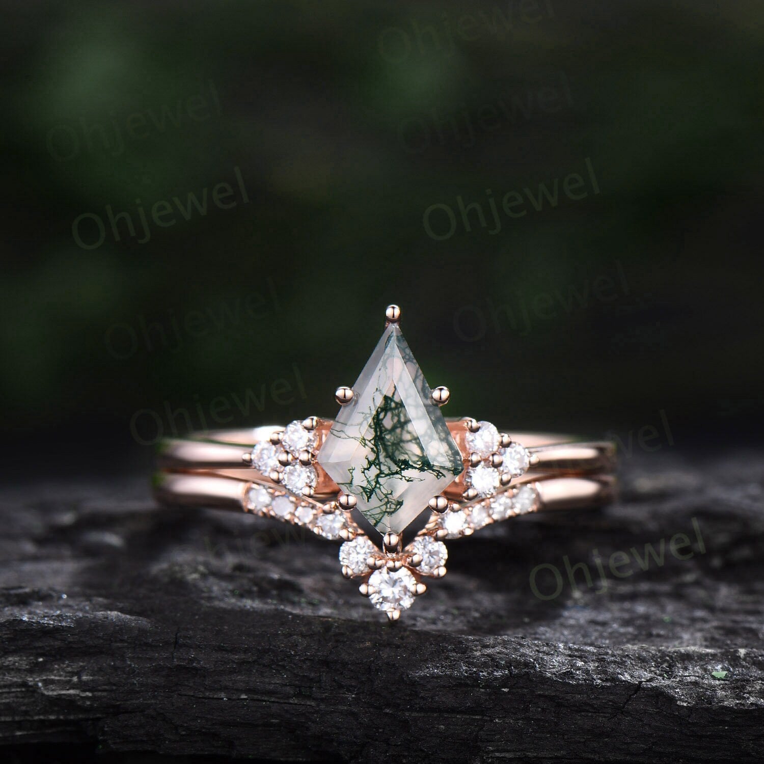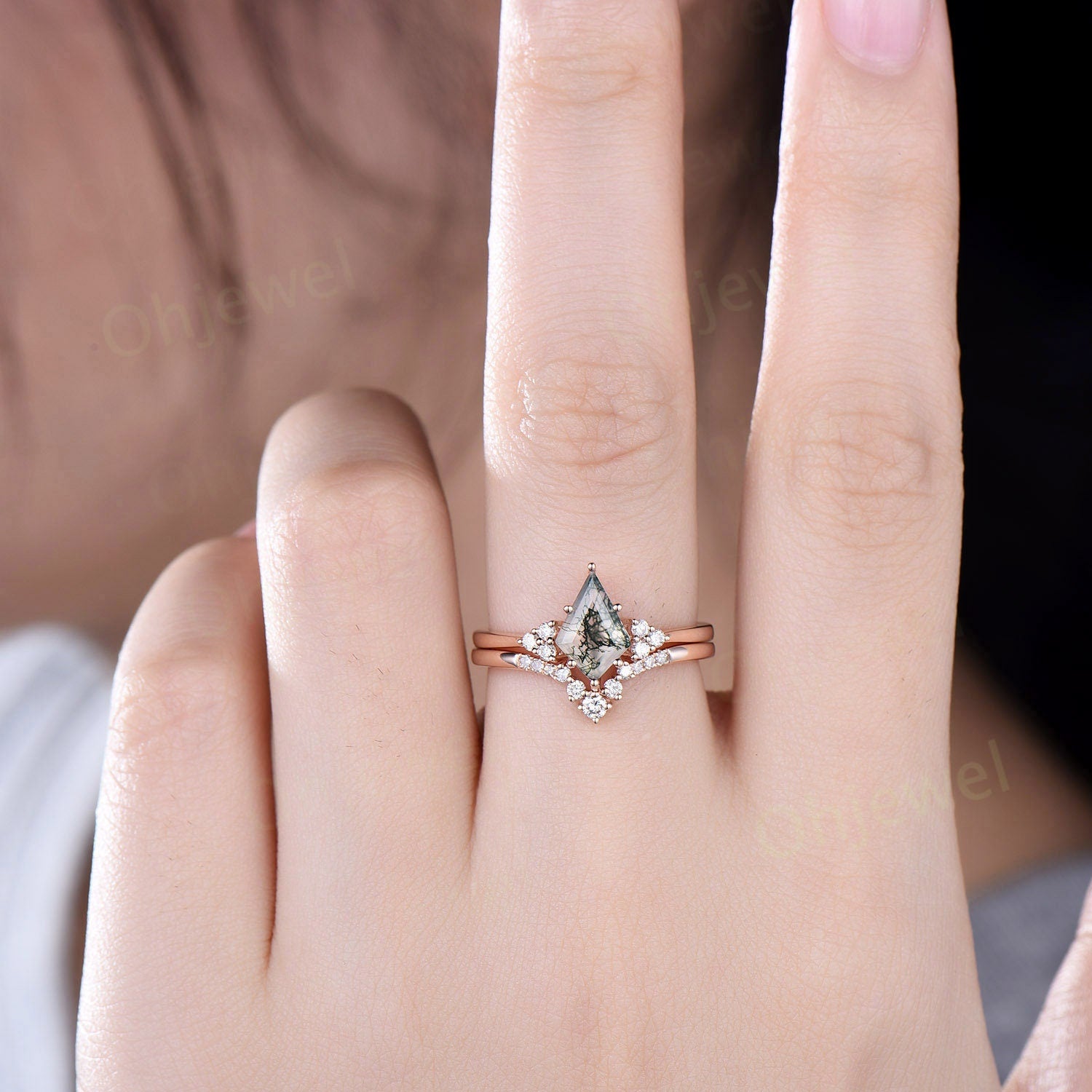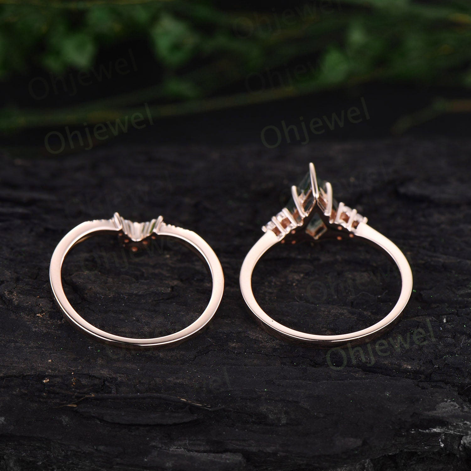 Green moss agate ring vintage kite cut moss agate engagement ring set Minimalist dainty rose gold ring diamond anniversary ring set women