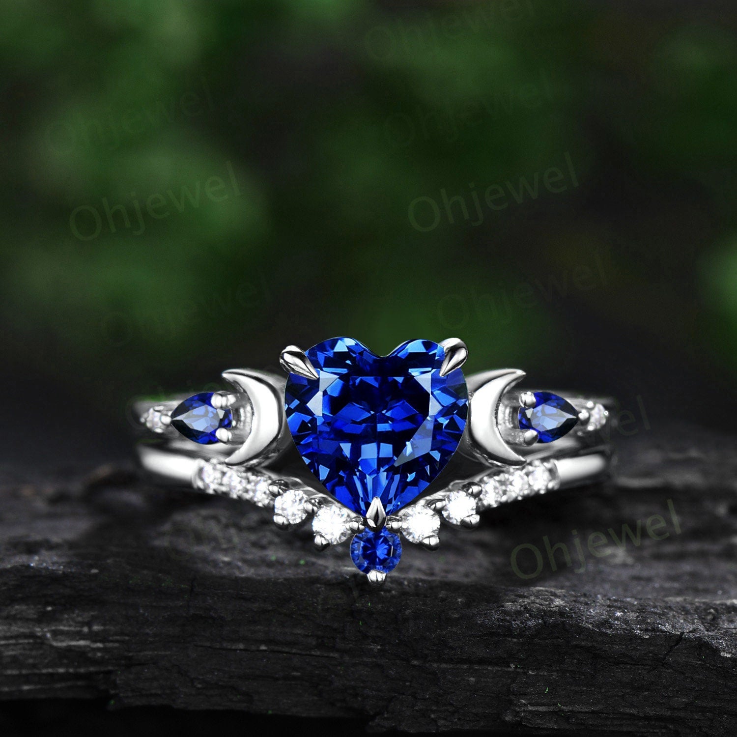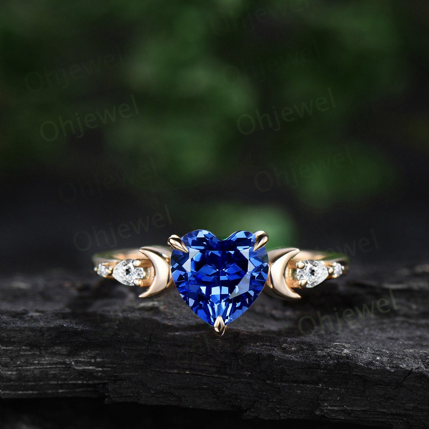 This is a lab sapphire engagement ring in solid gold,about 7mm 1.2ct heart shaped. The accent stones are lab sapphires and diamonds or moissanites.