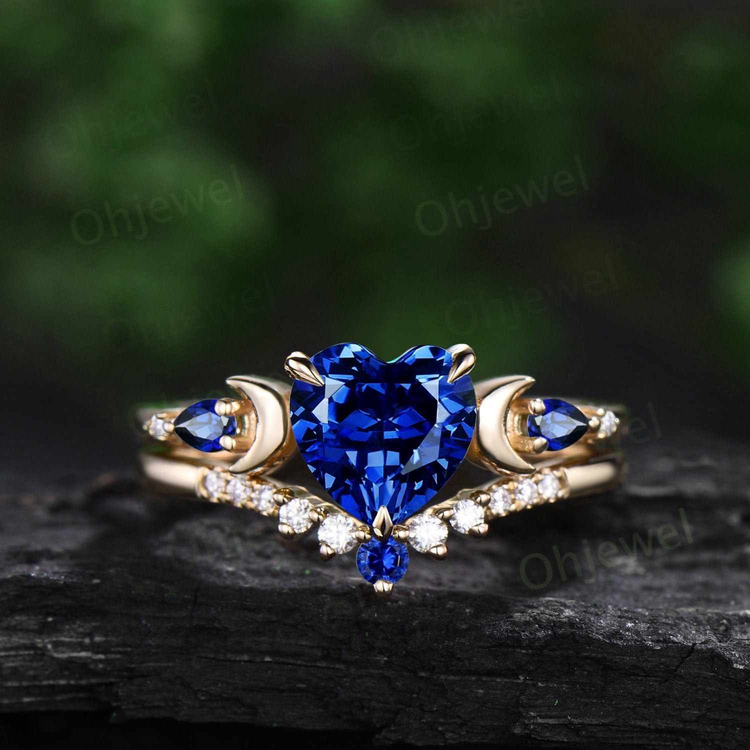 Heart shaped blue sapphire engagement ring set yellow gold five stone moon pear diamond promise wedding bridal ring set women jewelry