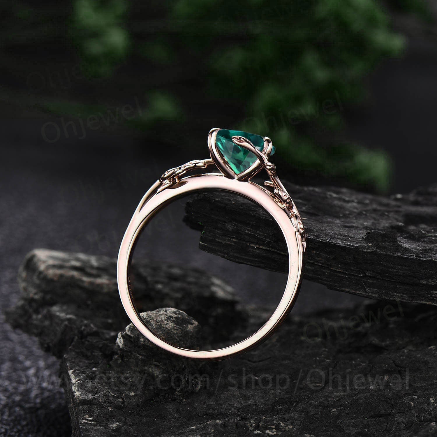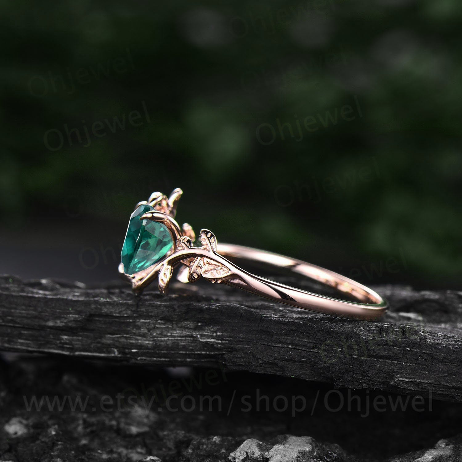 Heart shaped green emerald engagement ring leaf flower 14k rose gold silver unique vintage solitaire engagement ring wedding ring for women