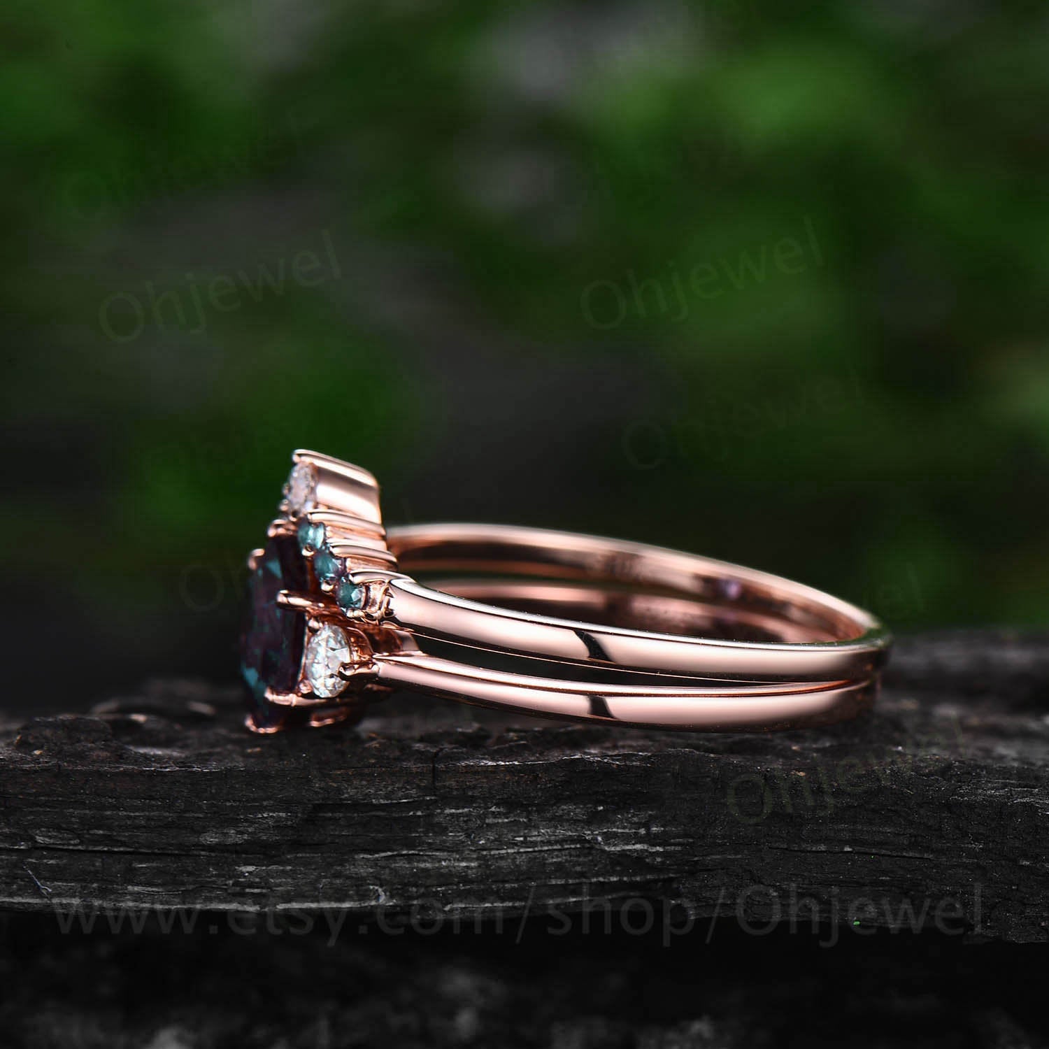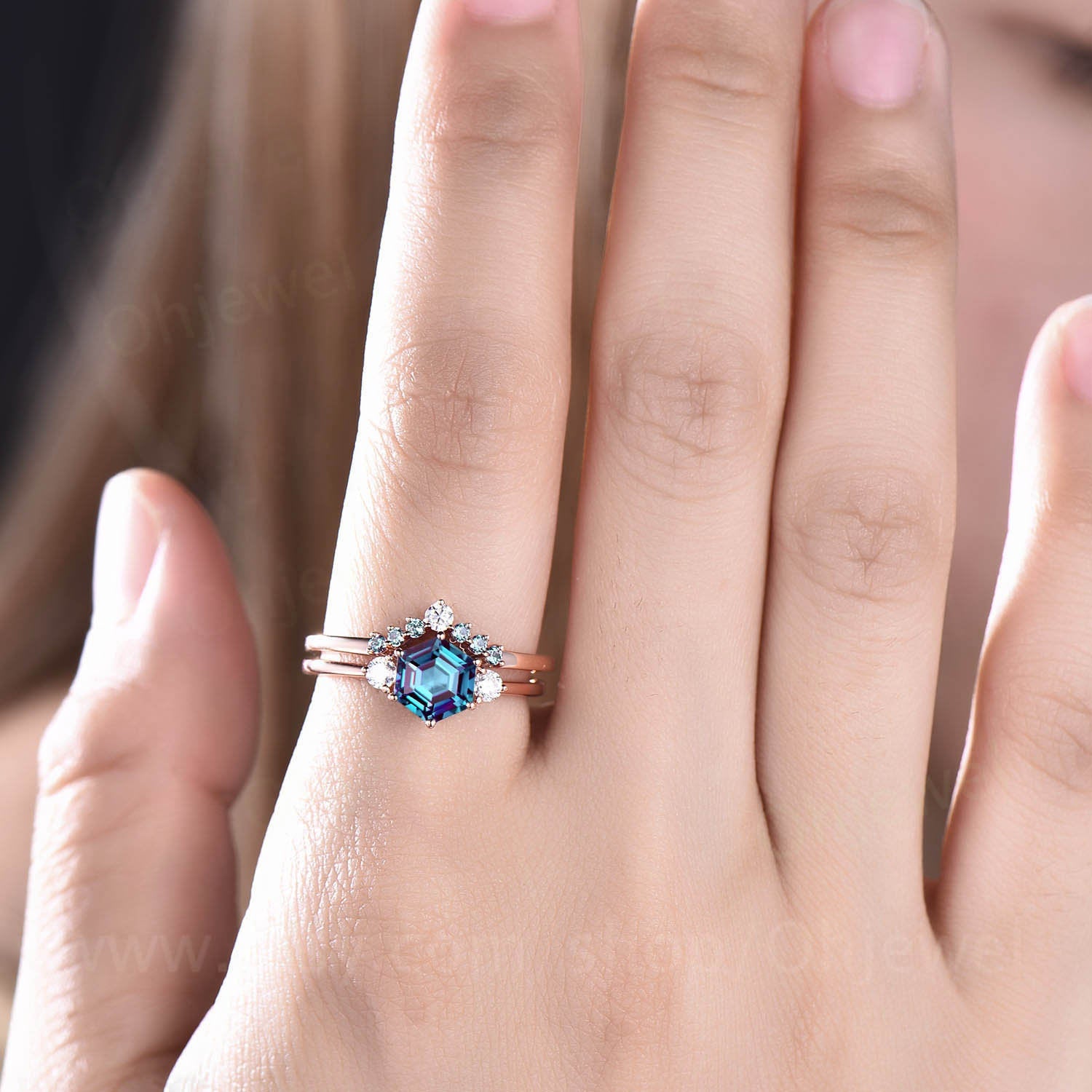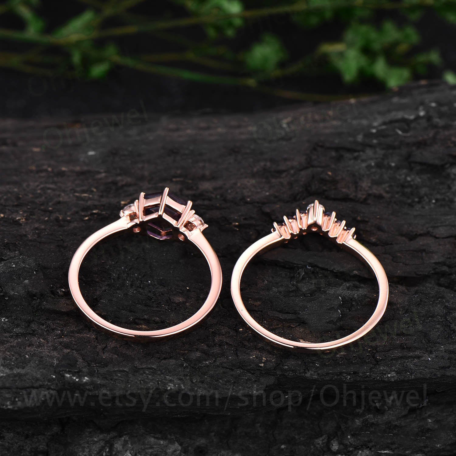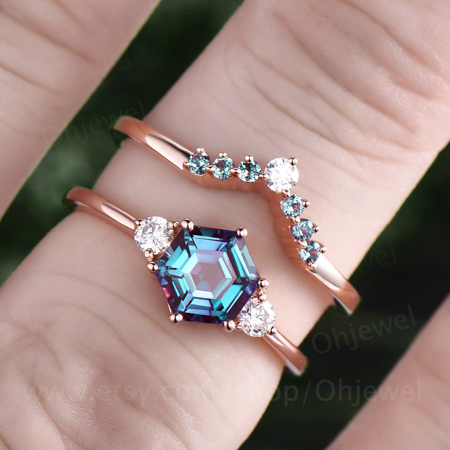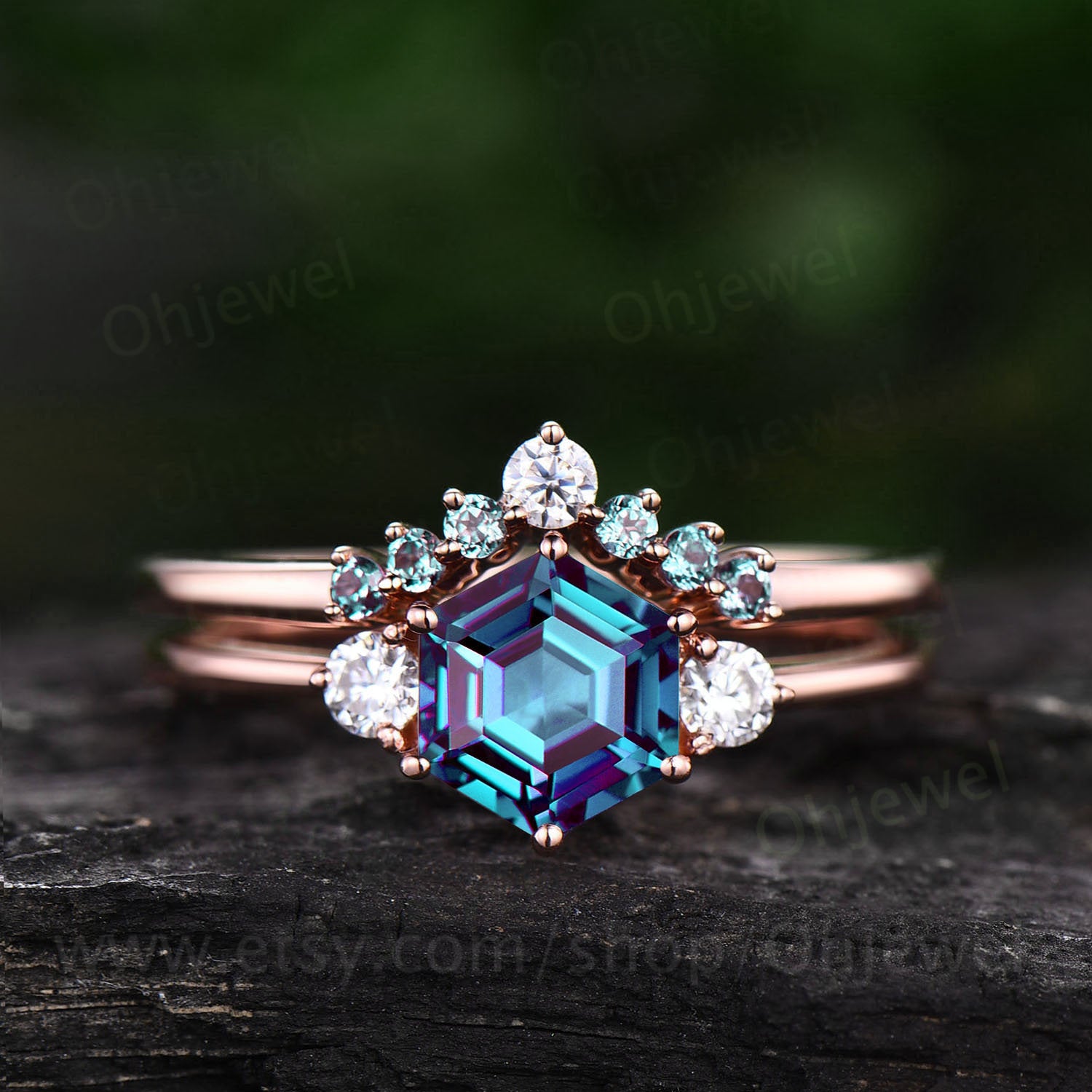 Hexagon alexandrite ring gold silver vintage alexandrite engagement ring set rose gold three stone moissanite bridal wedding ring set women