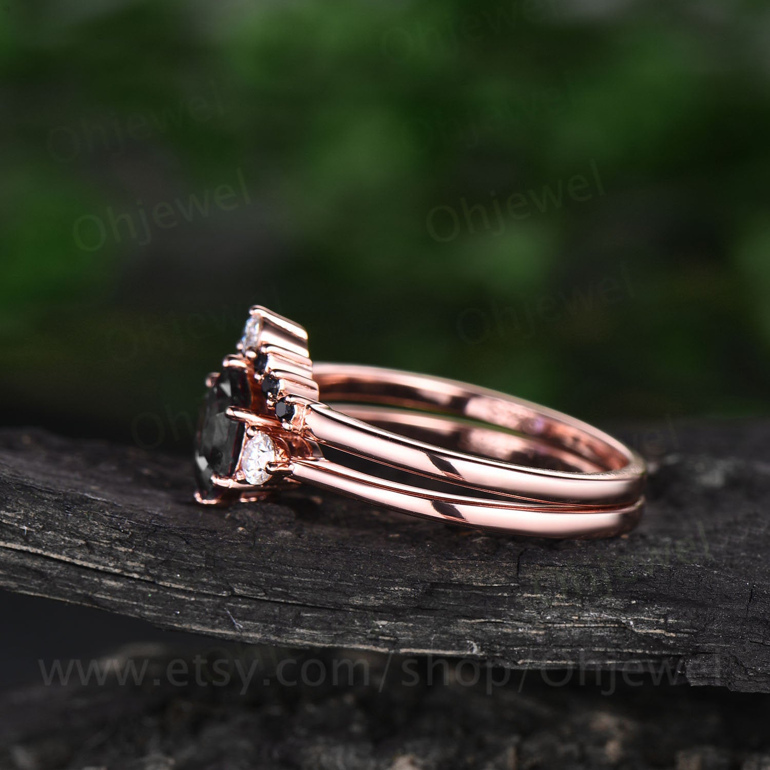 The wedding band stones are black diamonds and moissanite.