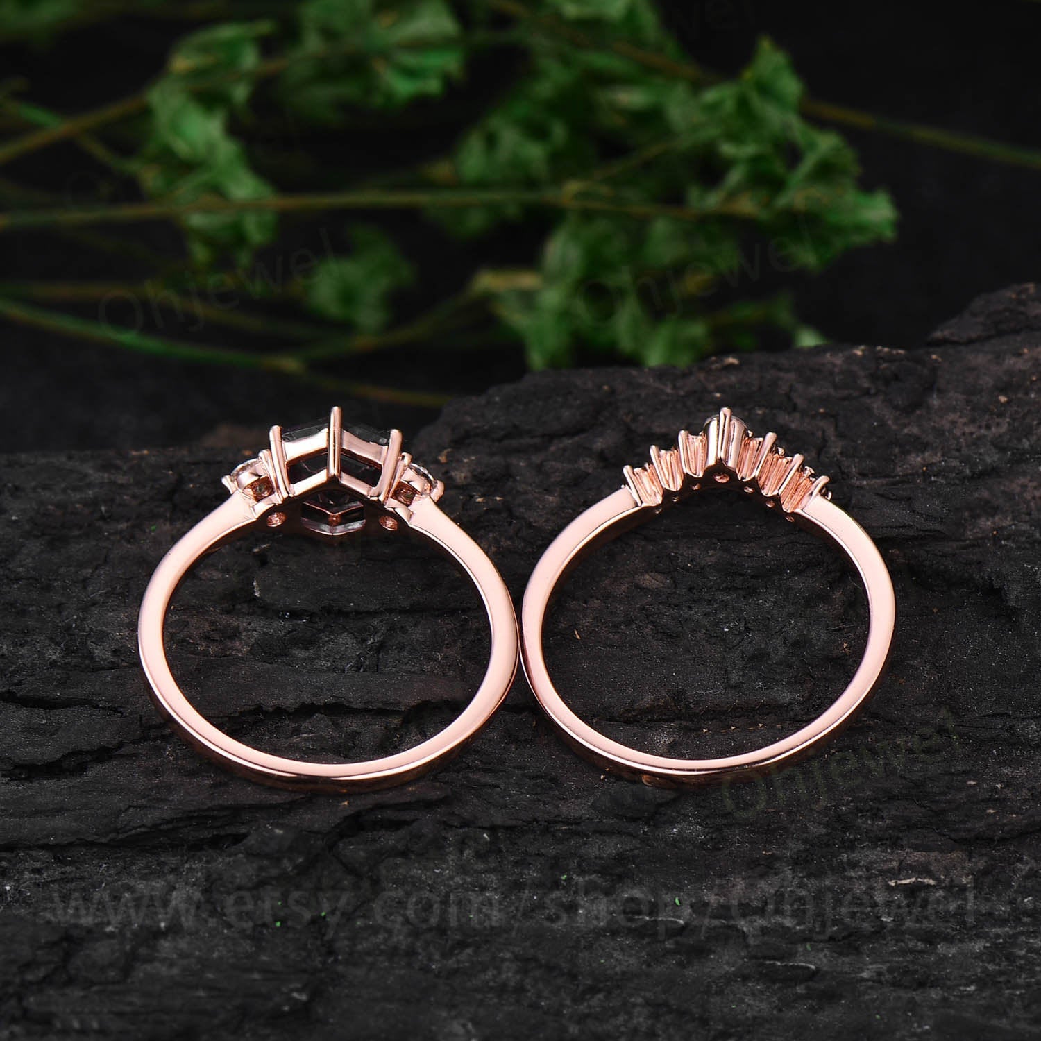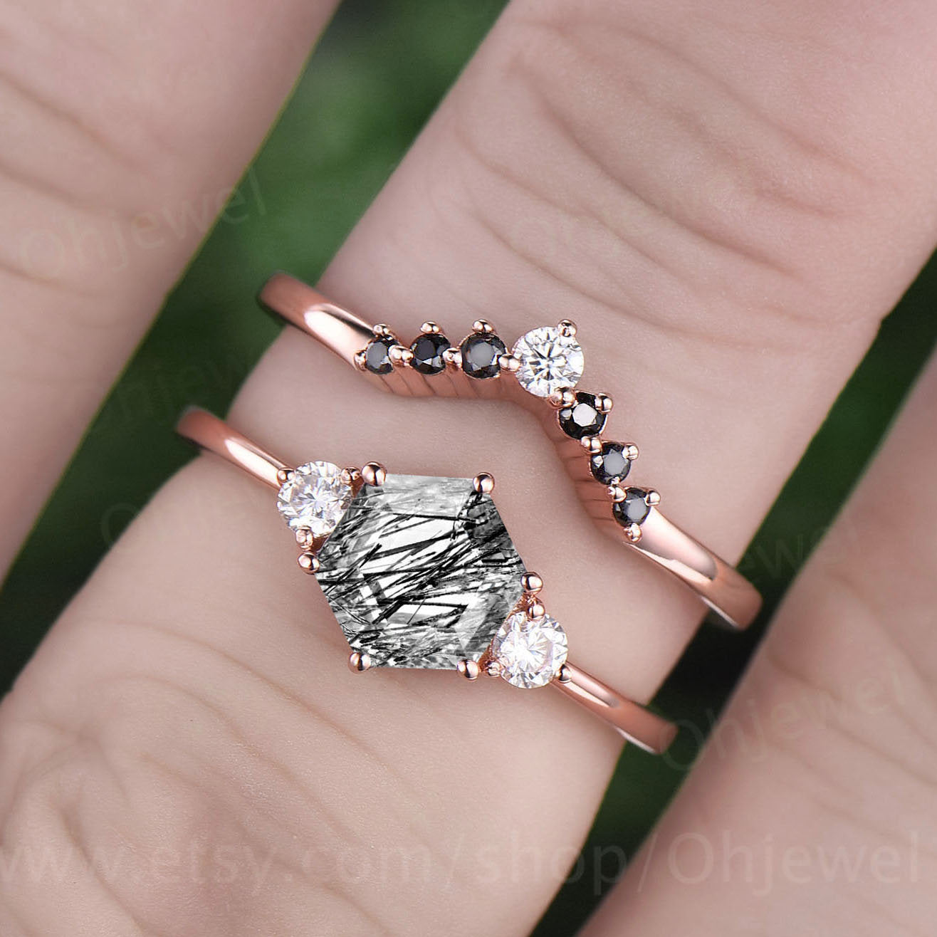 Hexagon black rutilated quartz engagement ring set three stone rose gold silver ring black diamond ring women moissanite wedding set gift