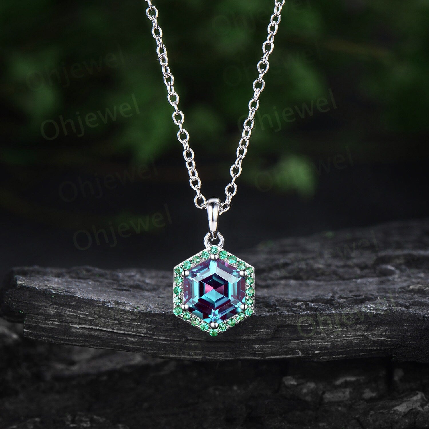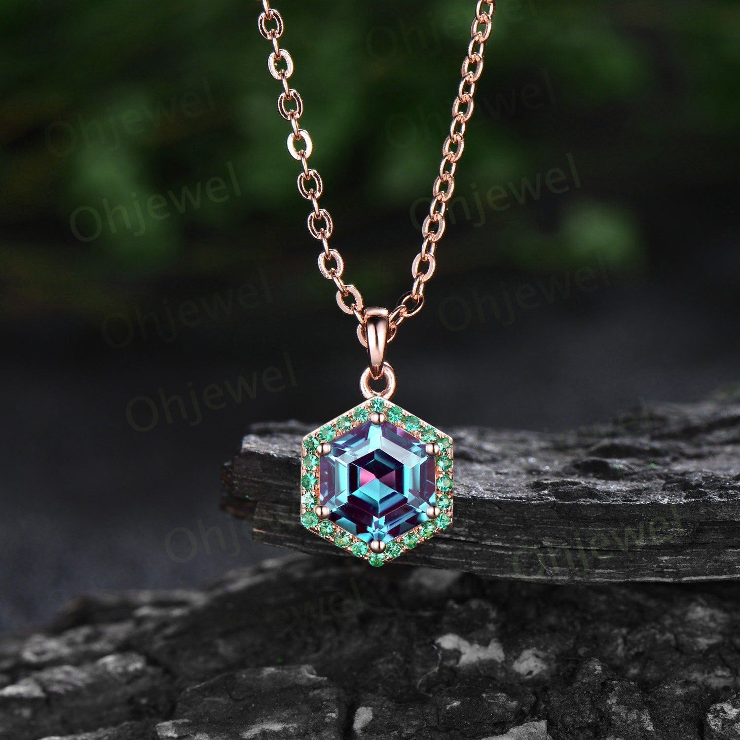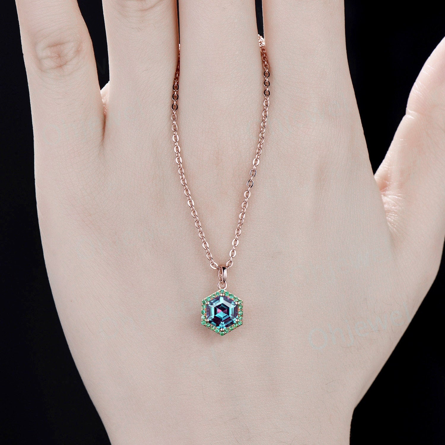 Hexagon cut Alexandrite necklace dainty halo emerald unique necklace Pendant for women June birthstone 14k rose gold jewelry gift
