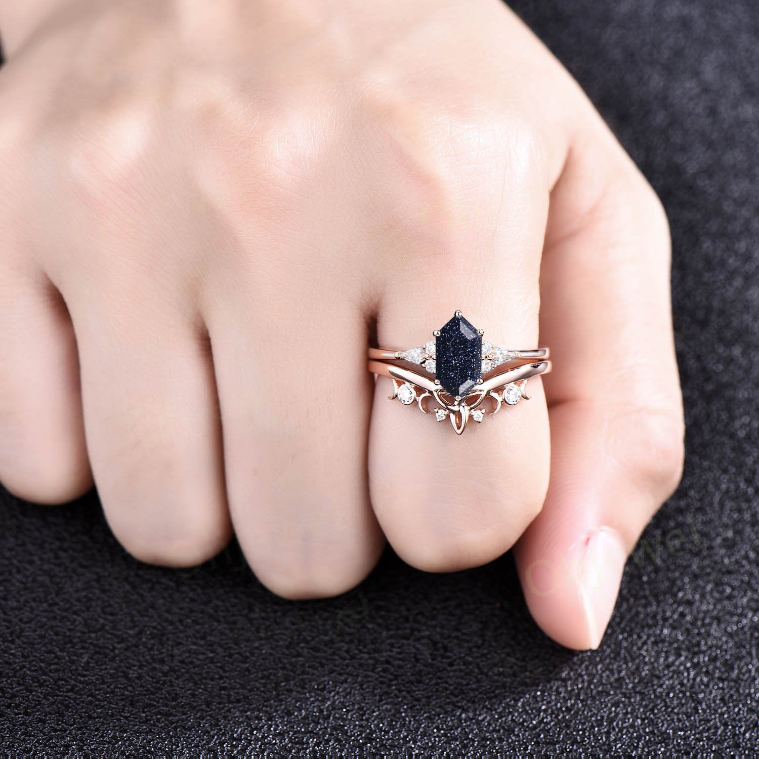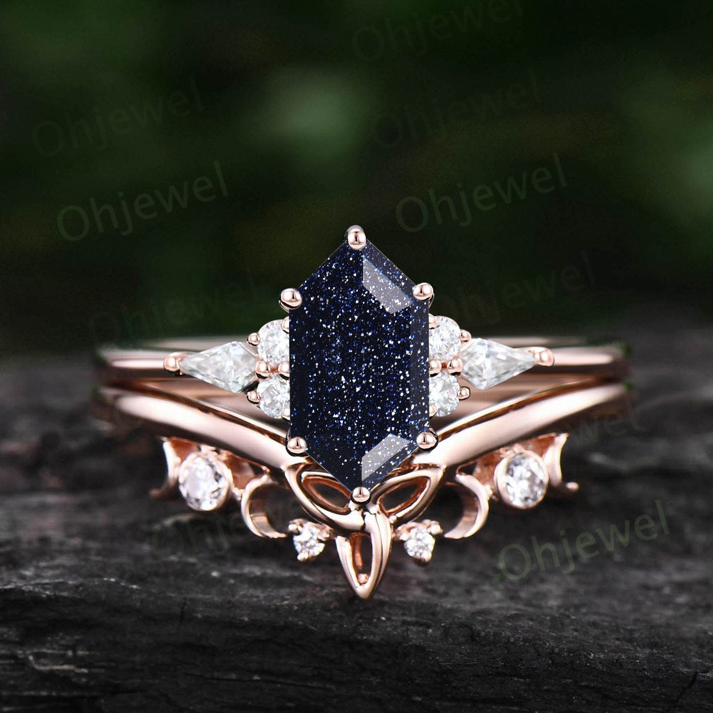 Hexagon cut blue goldstone ring vintage blue sandstone engagement ring set solid 14k gold kite moissanite anniversary ring set women gift