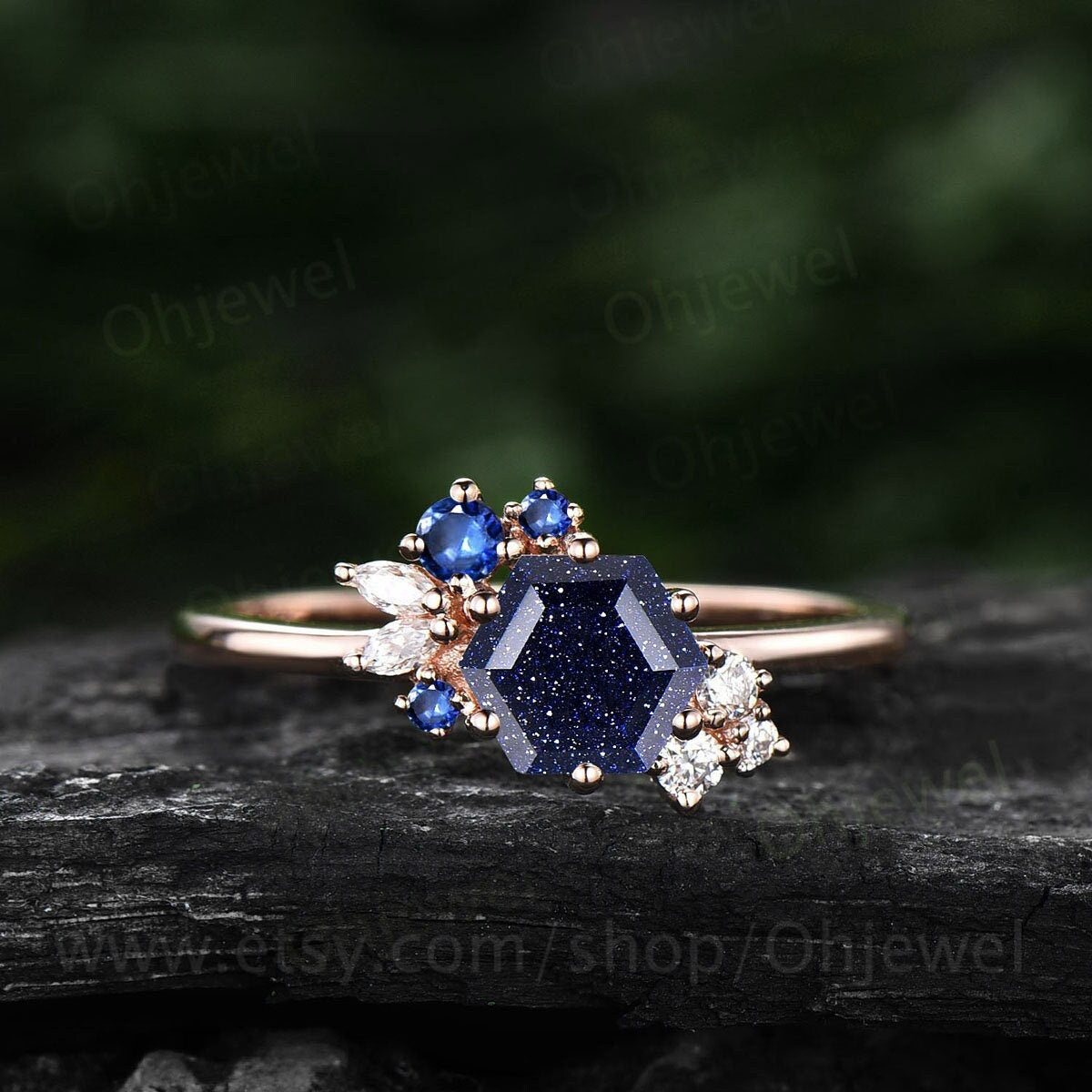 Hexagon cut blue sandstone ring rose gold silver for women vintage unique engagement ring dainty art deco sapphire moissanite wedding ring