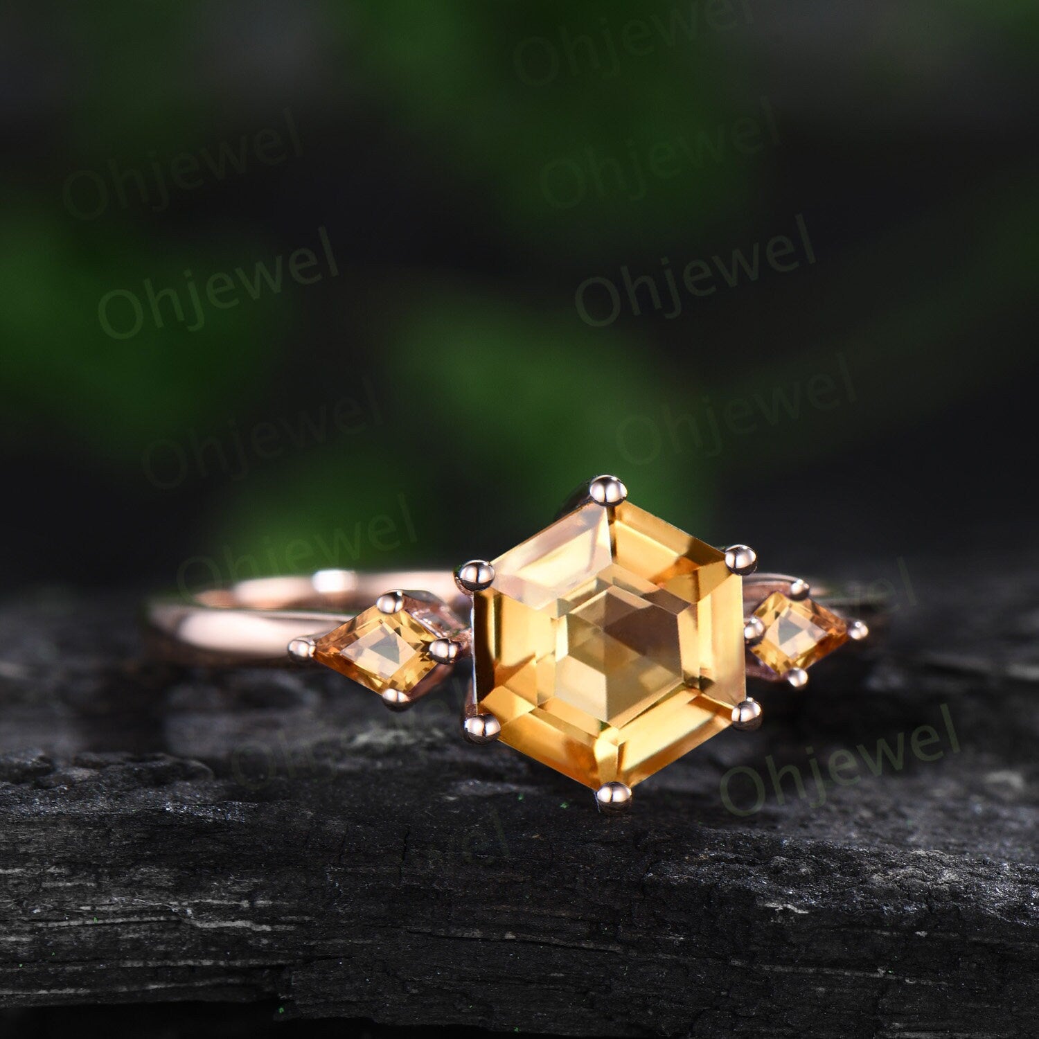 This is a yellow citrine engagement ring in solid gold,about 7x7mm Hexagon.