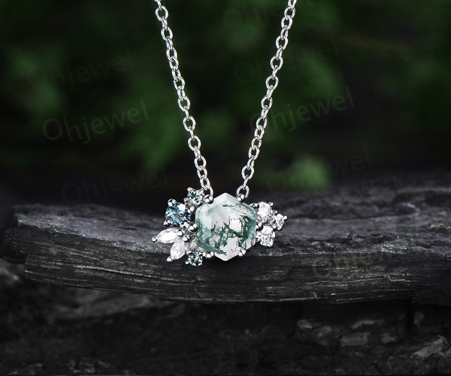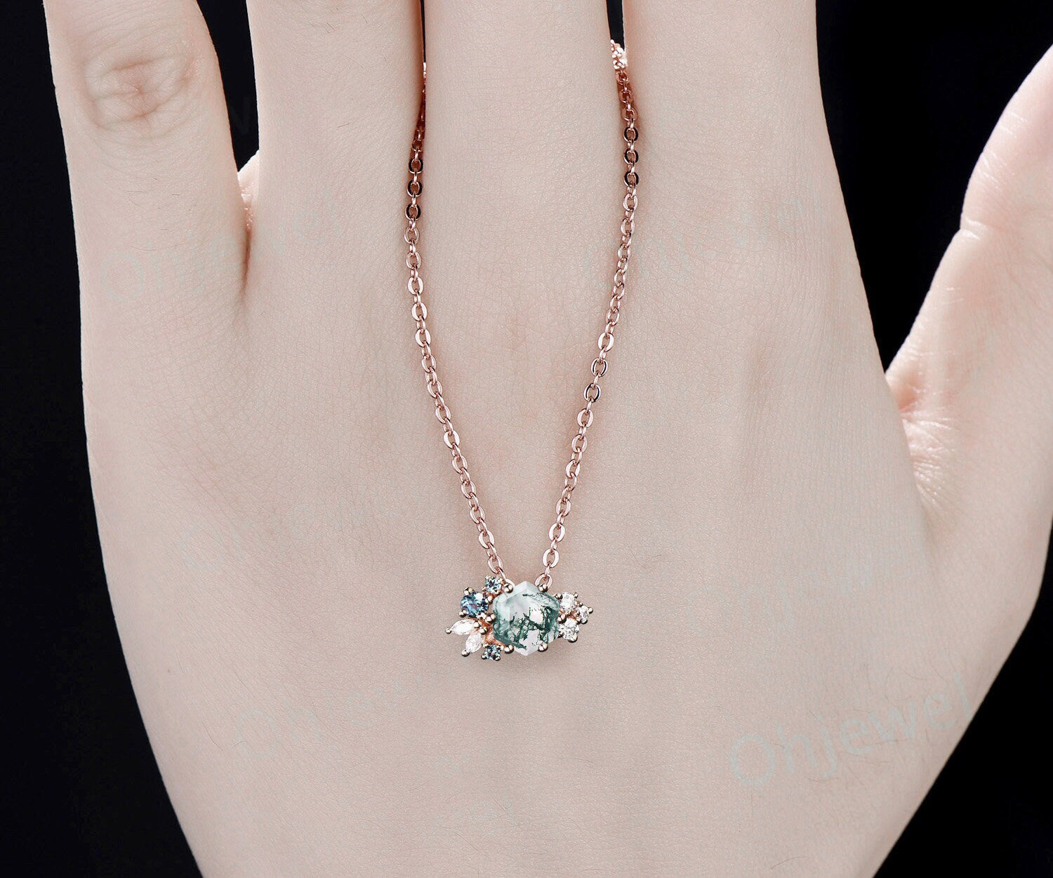 Hexagon cut green moss agate necklace rose gold women vintage unique art deco cluster alexandrite diamond necklace Pendant anniversary gift