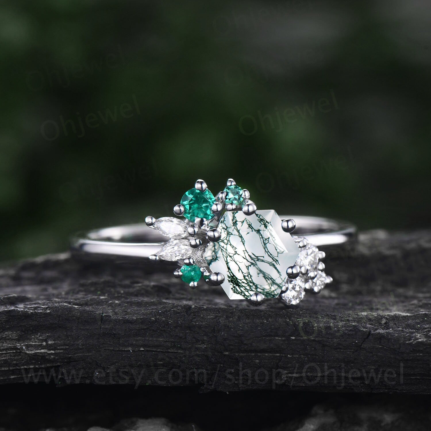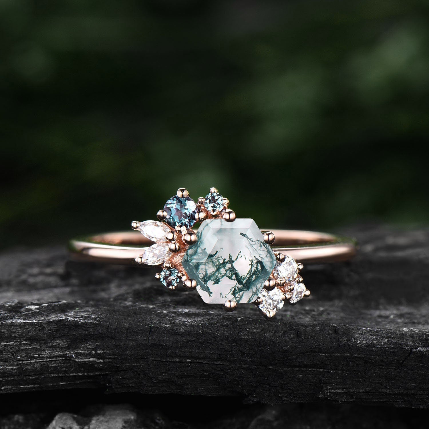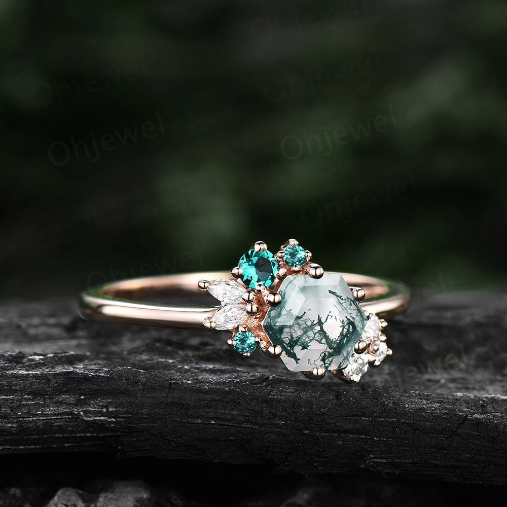 Hexagon cut green moss agate ring rose gold silver vintage unique engagement ring cluster emerald moissanite bridal wedding ring women gift