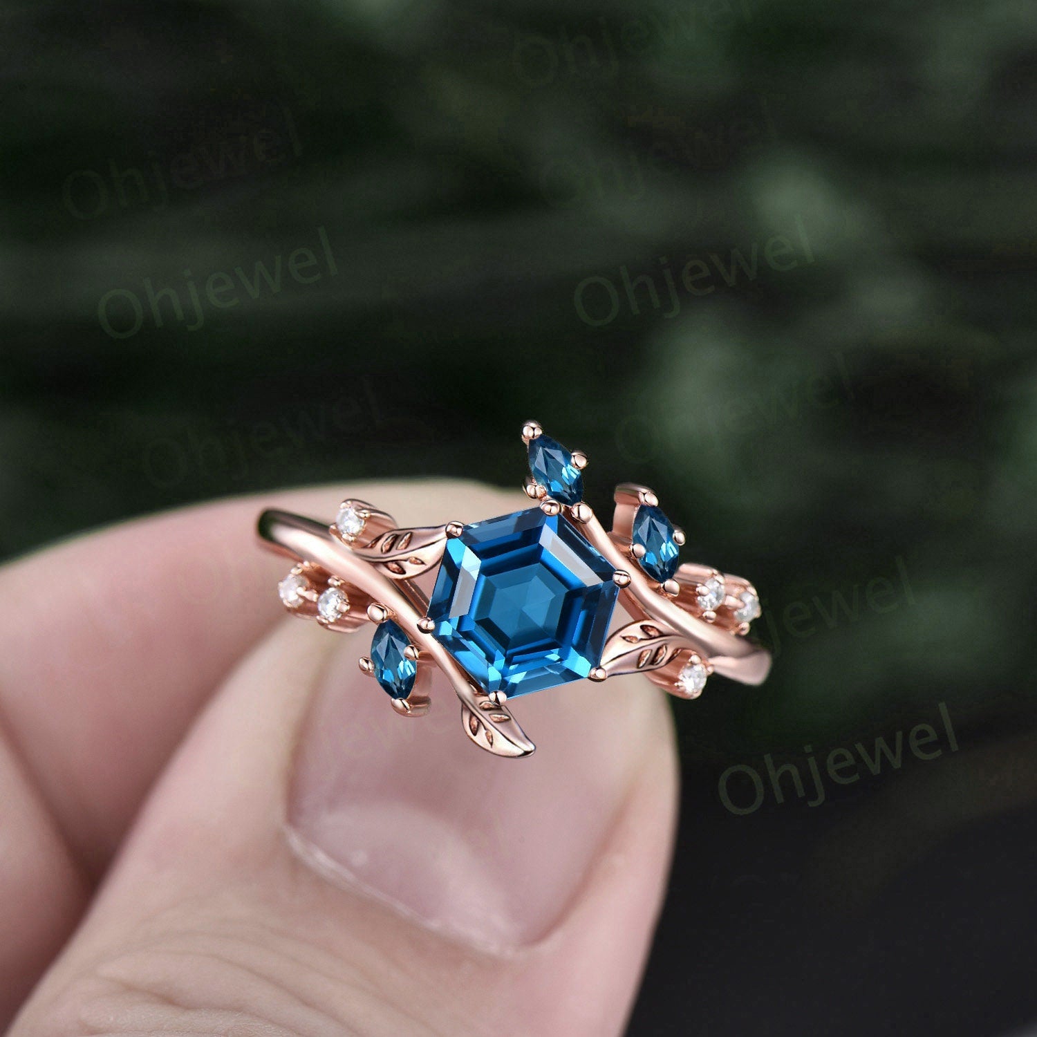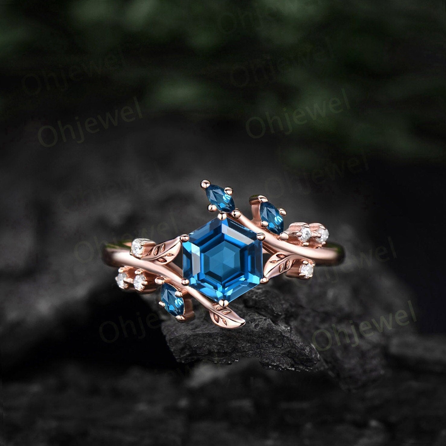Hexagon cut London blue topaz engagement ring rose gold Nature inspired leaf twig diamond ring women cluster alexandrite ring silver gift