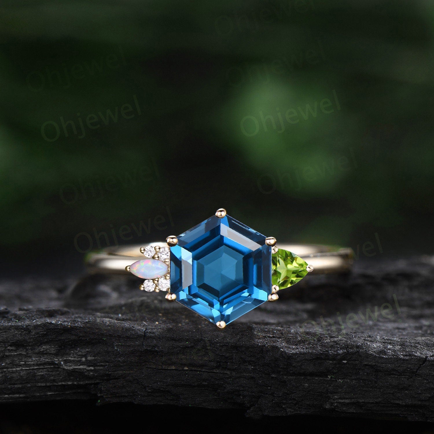 Hexagon cut London blue topaz ring rose gold trillion peridot ring vintage unique engagement ring cluster opal moissanite ring women gift