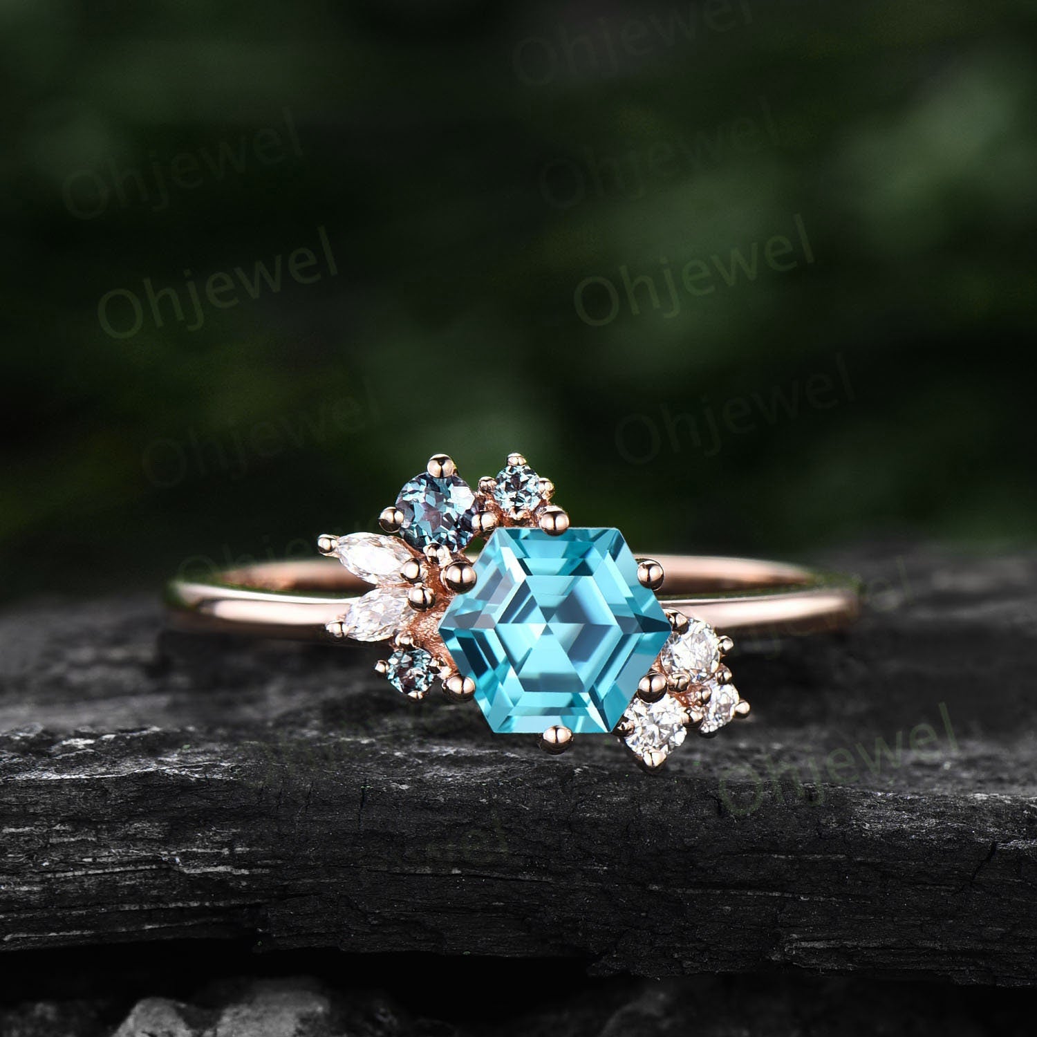 Hexagon cut Paraiba engagement ring 6 prong rose gold cluster Alexandrite diamond wedding anniversary ring women gift