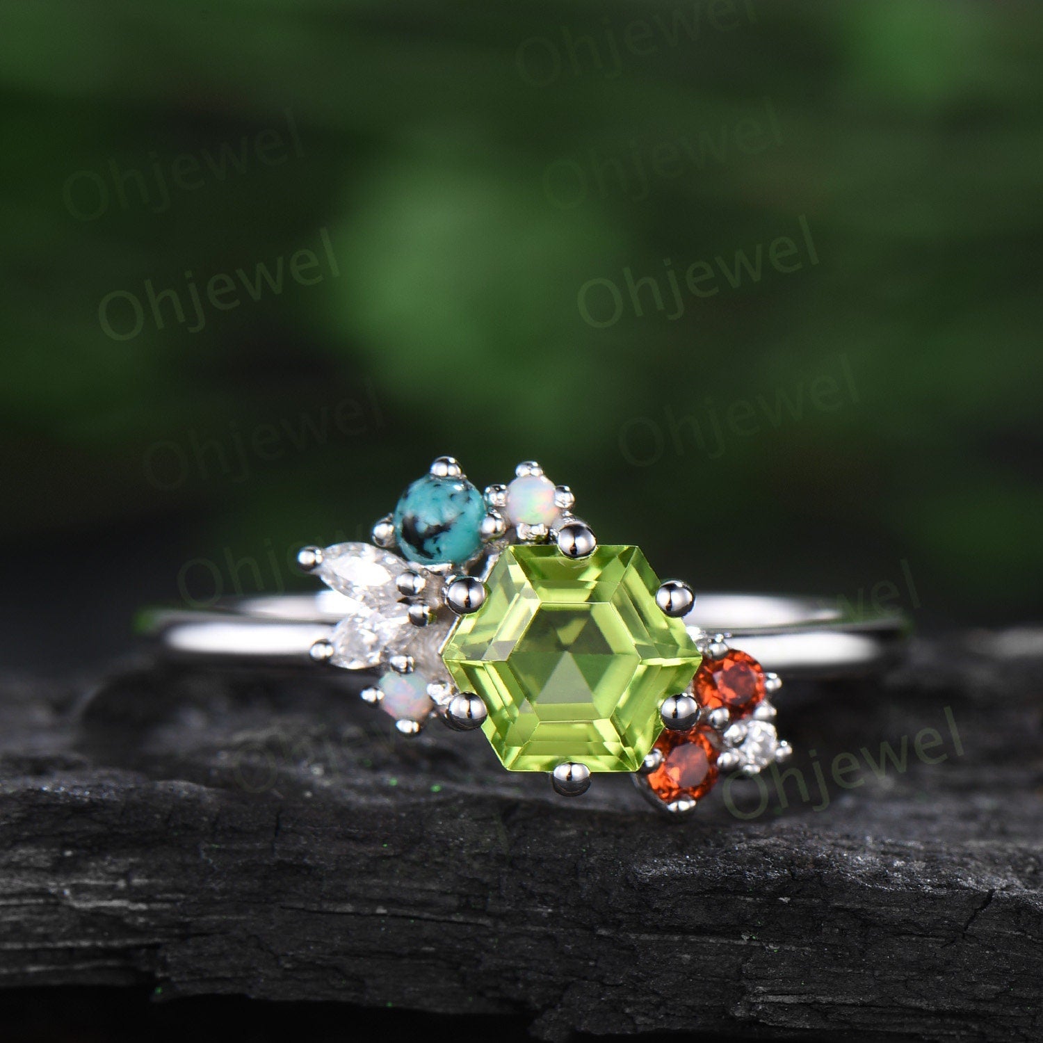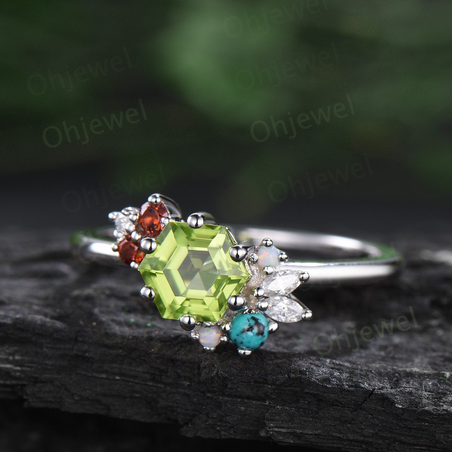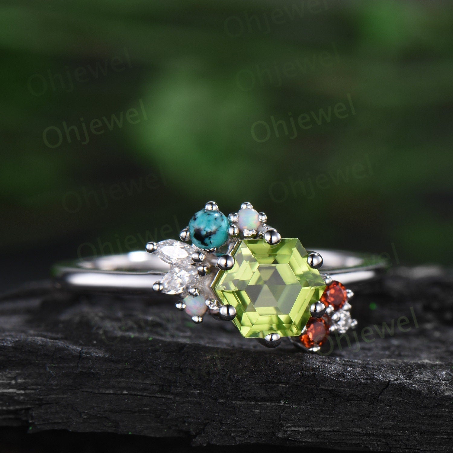 Hexagon cut peridot ring vintage cluster opal garnet Turquoise moissanite ring white gold unique engagement ring Personalizedgemstone ring