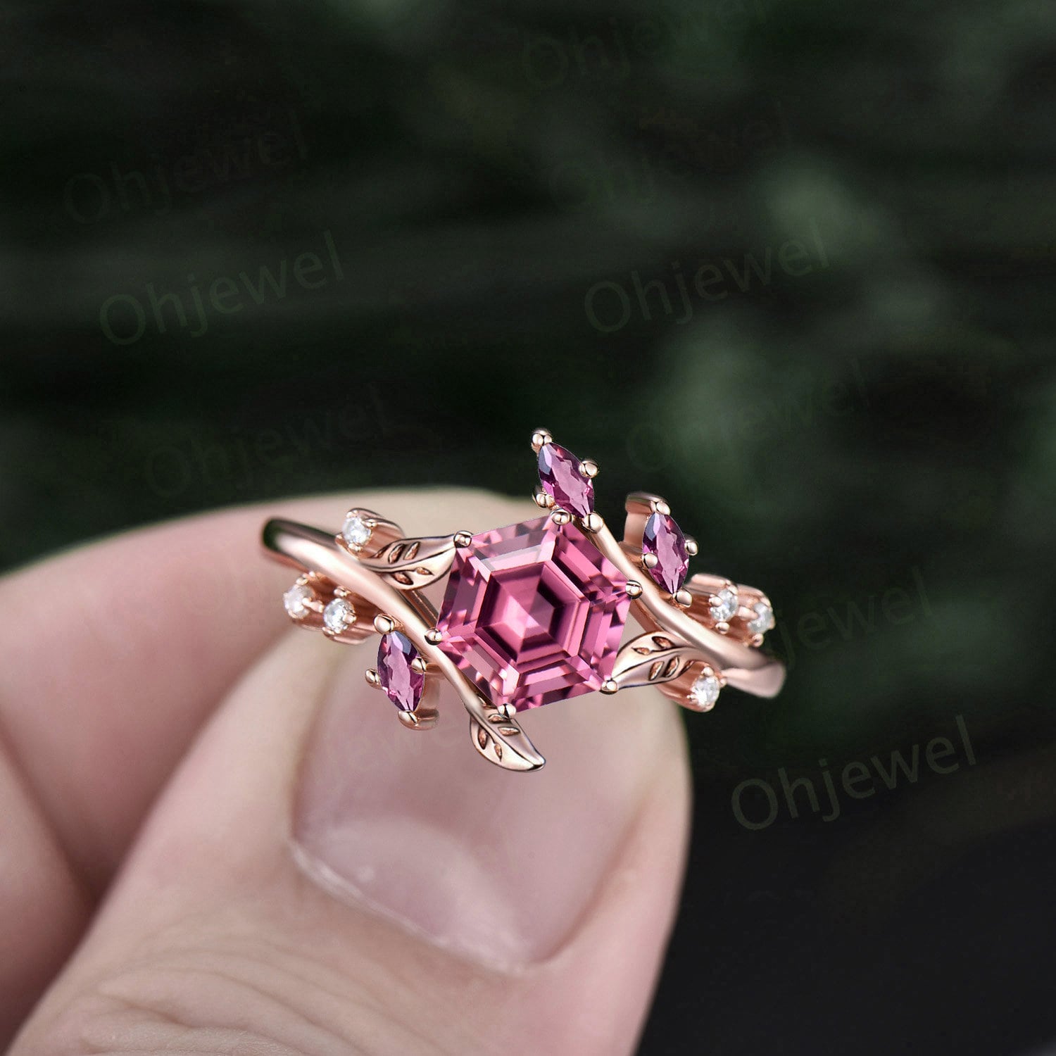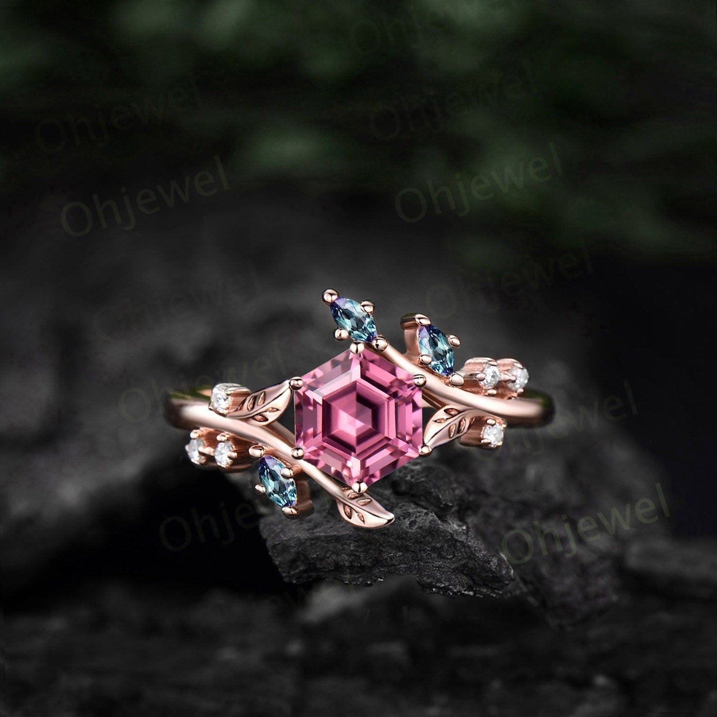 Hexagon cut Pink Tourmaline engagement ring 14k rose gold Nature inspired leaf twig diamond ring women cluster alexandrite ring silver gift