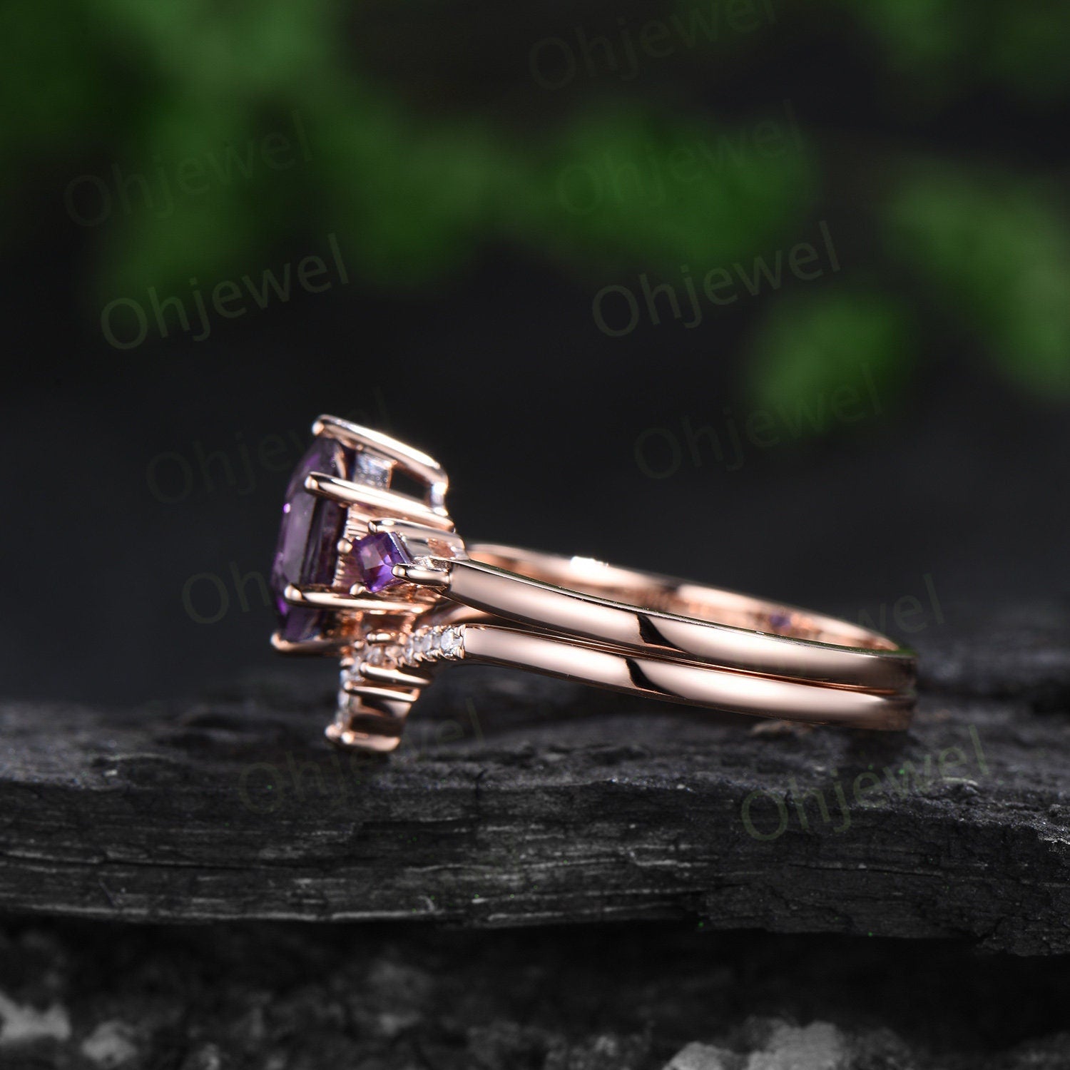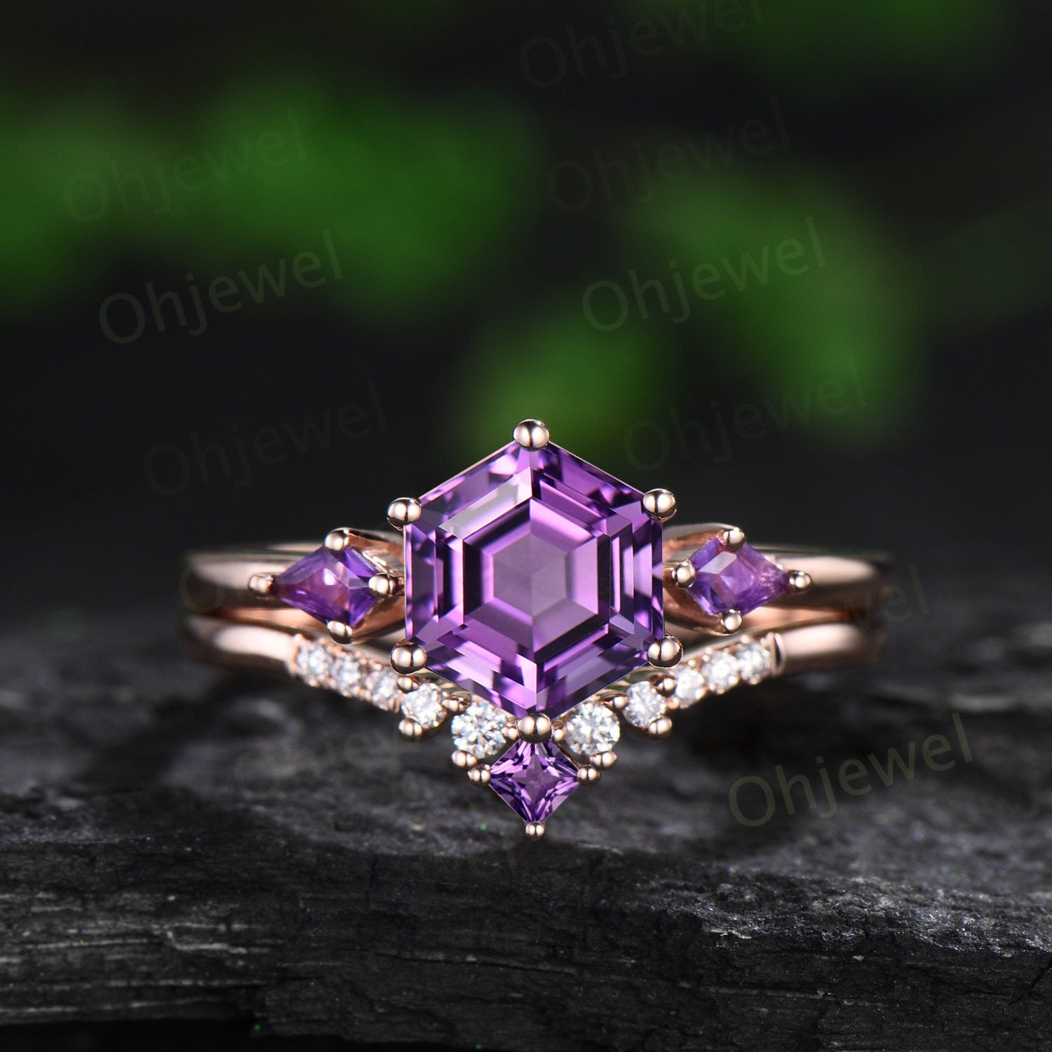 Hexagon cut purple amethyst ring rose gold kite three stone unique engagement ring minimalist moissanite anniversary ring set gift for women