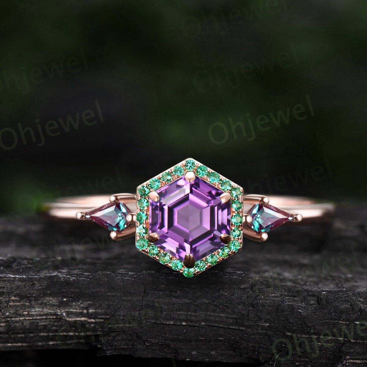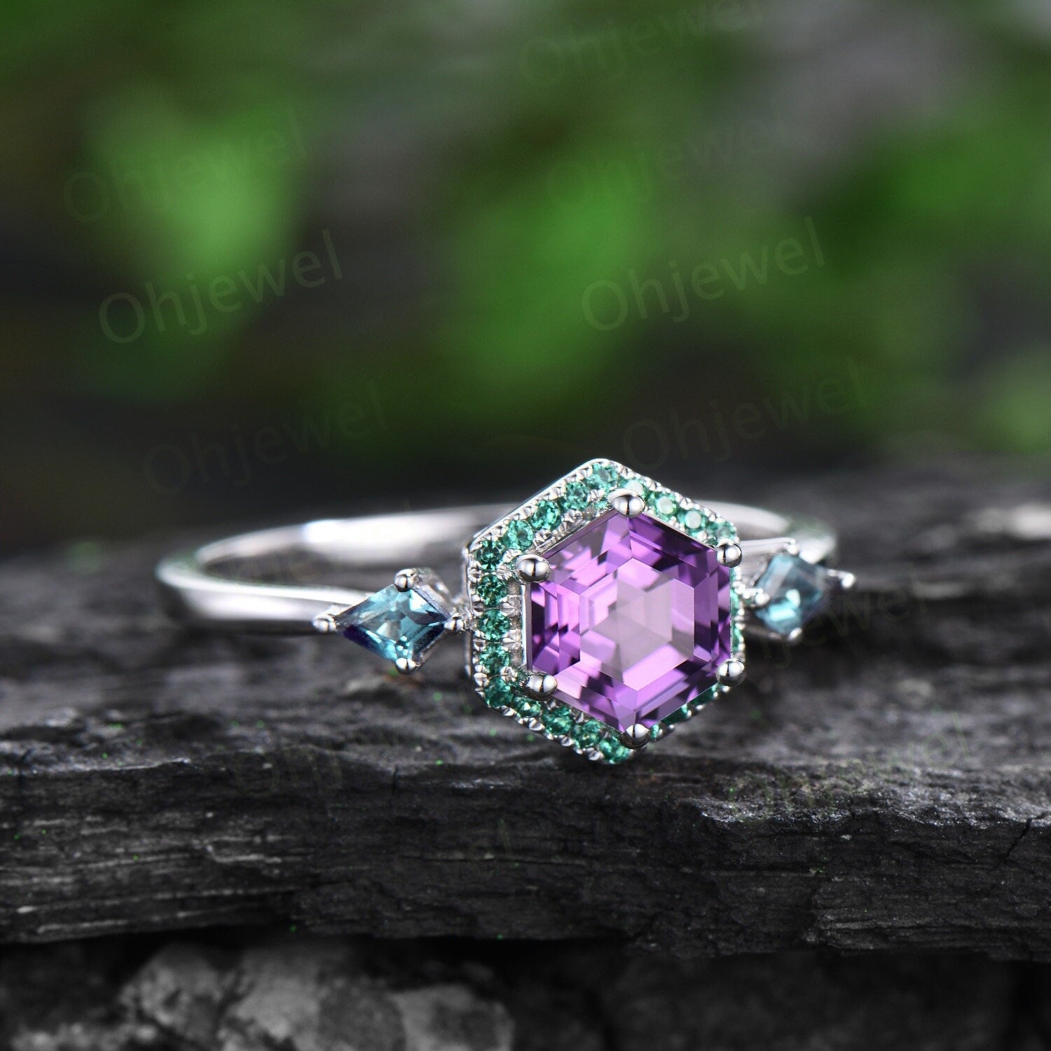 Hexagon cut purple Amethyst ring white gold halo emerald ring vintage kite cut alexandrite ring women unique engagement ring gemstone ring