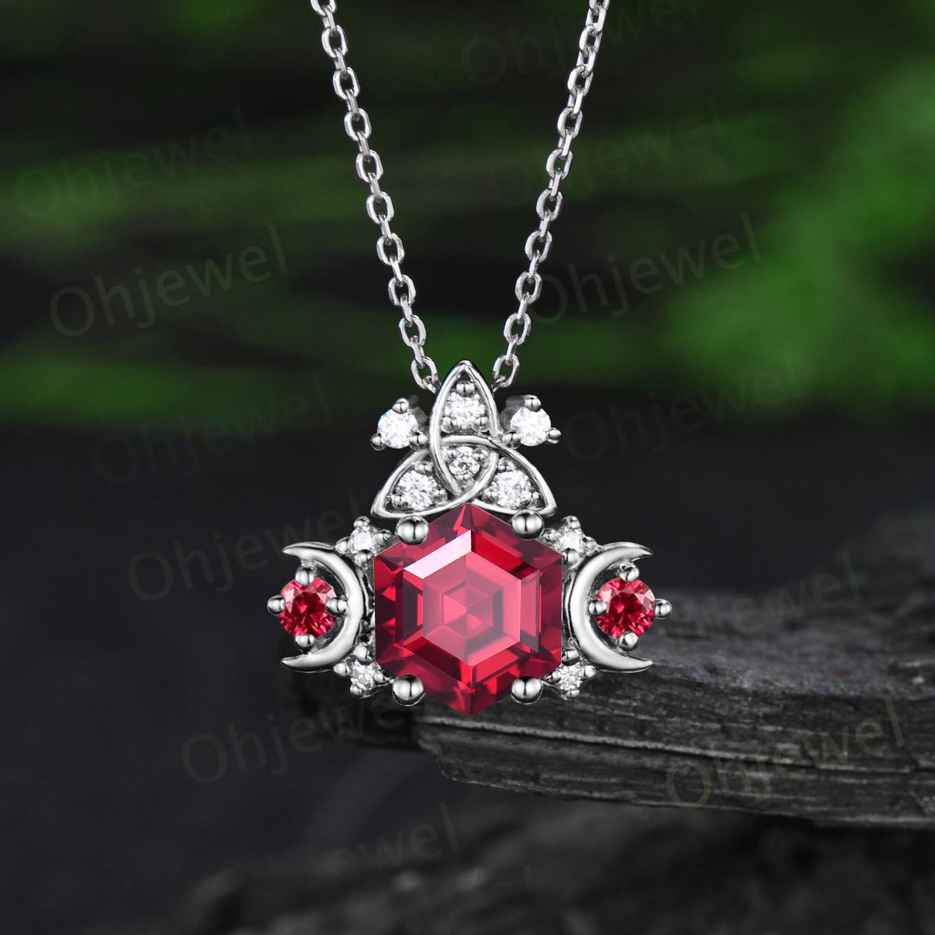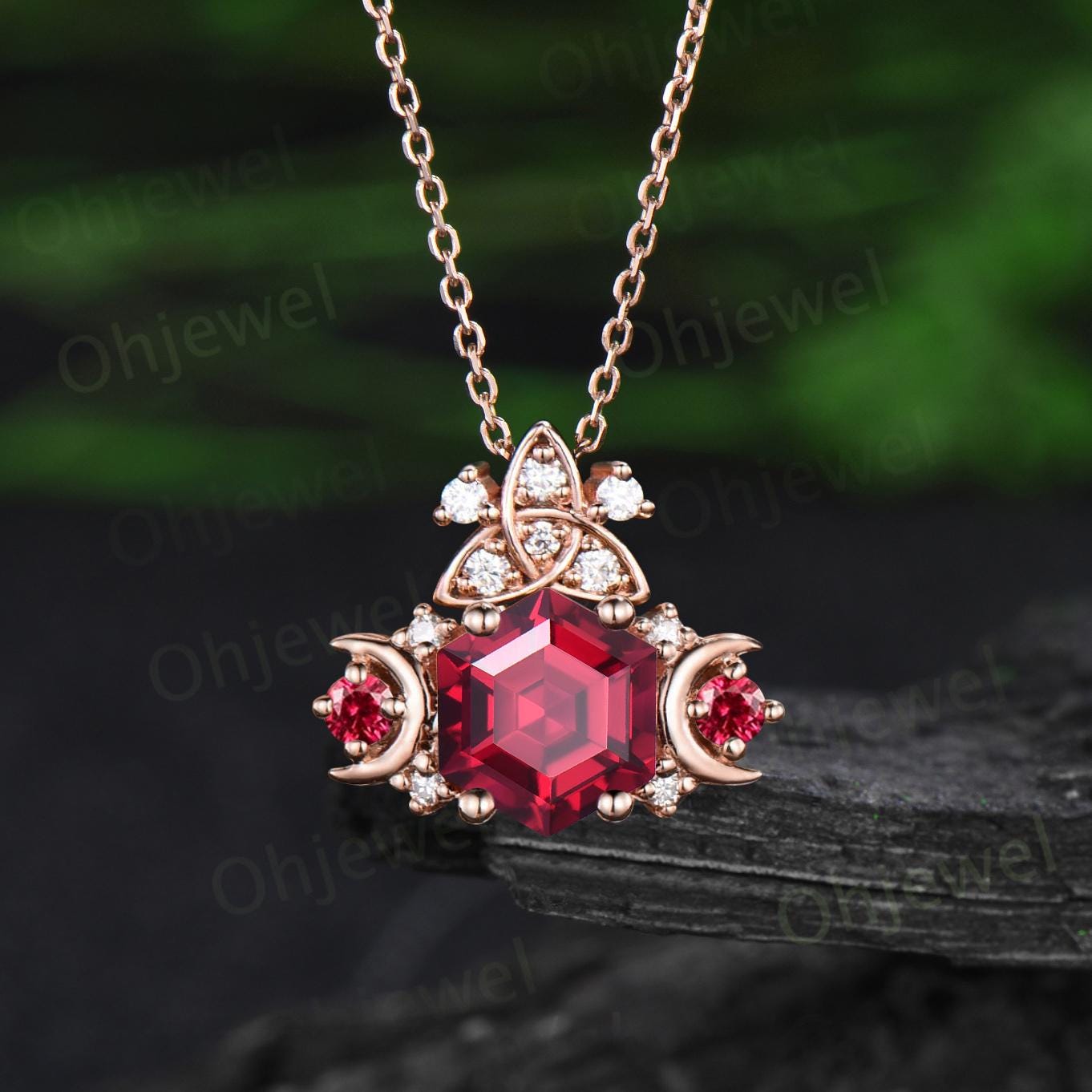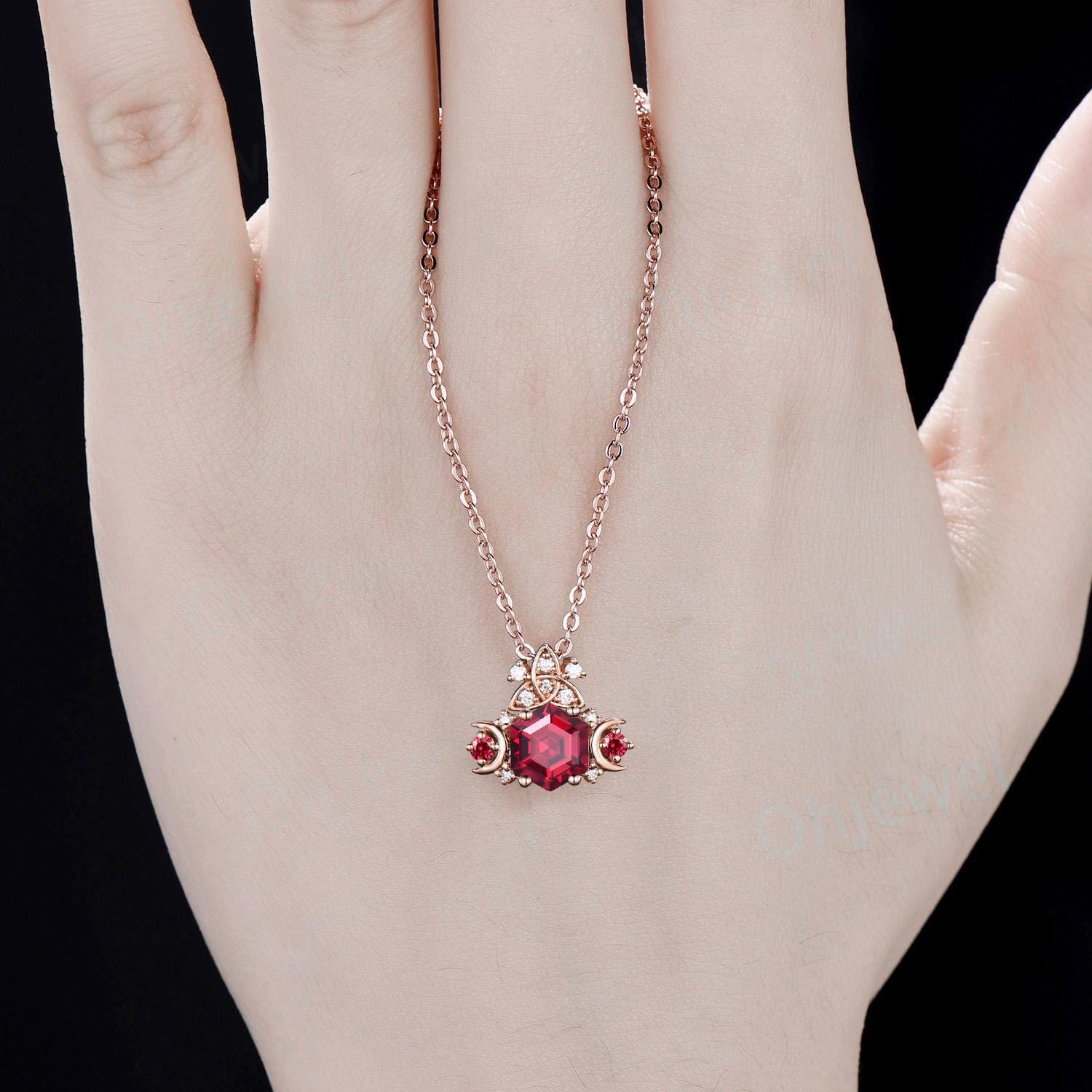 Hexagon cut red ruby necklace celtic knot moon cluster diamond pendant rose gold July birthstone anniversary gift women