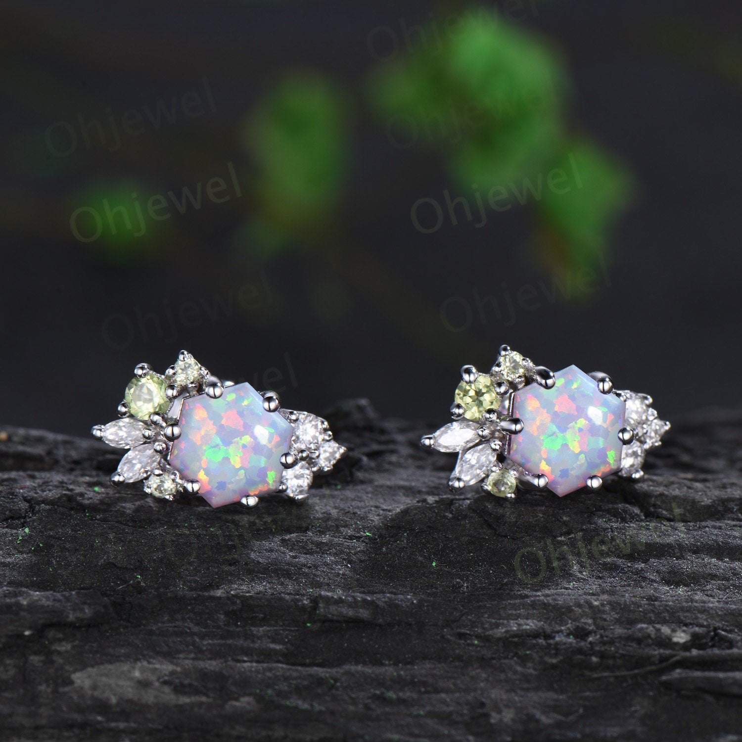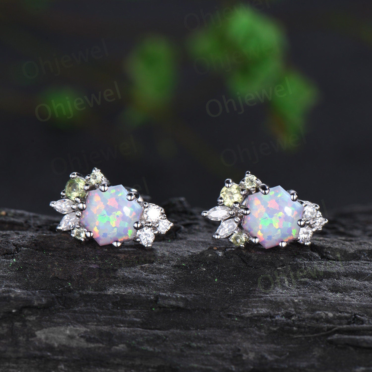 Hexagon opal earrings solid 14k 18k white gold cluster peridot moissanite stud earrings women wedding anniversary gift jewelry