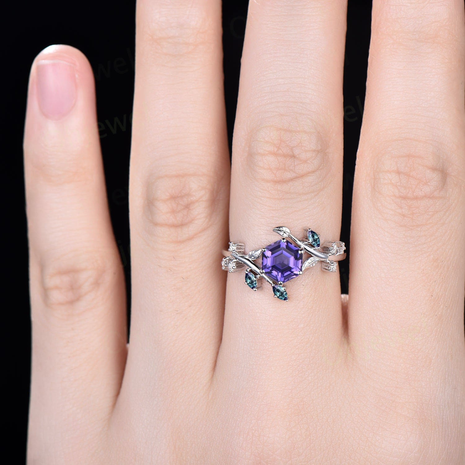 Hexagon purple sapphire ring vintage leaf Nature inspired engagement ring women twig cluster Alexandrite ring women rose gold gemstone ring