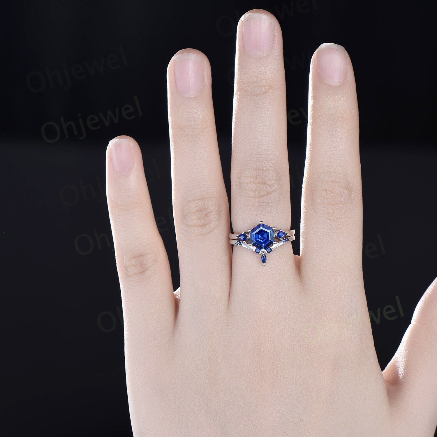 Hexagon sapphire engagement ring set white gold three stone princess kite sapphire ring blue gemstone unique promise ring set women gift