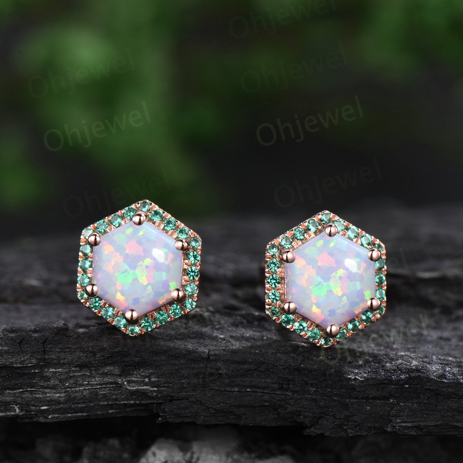 Hexagon white opal earrings solid 14k 18k rose gold October birthstone halo emerald stud earrings women dainty bridal anniversary gift