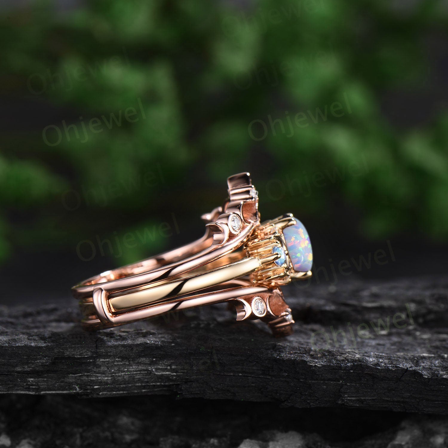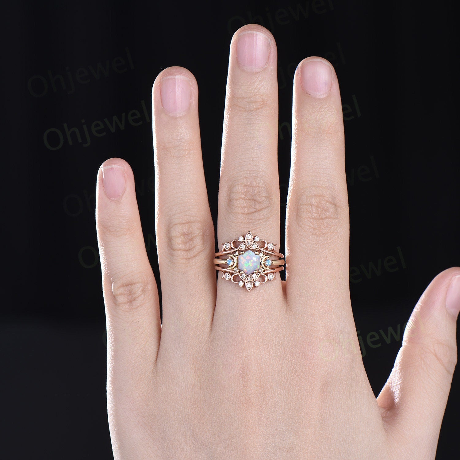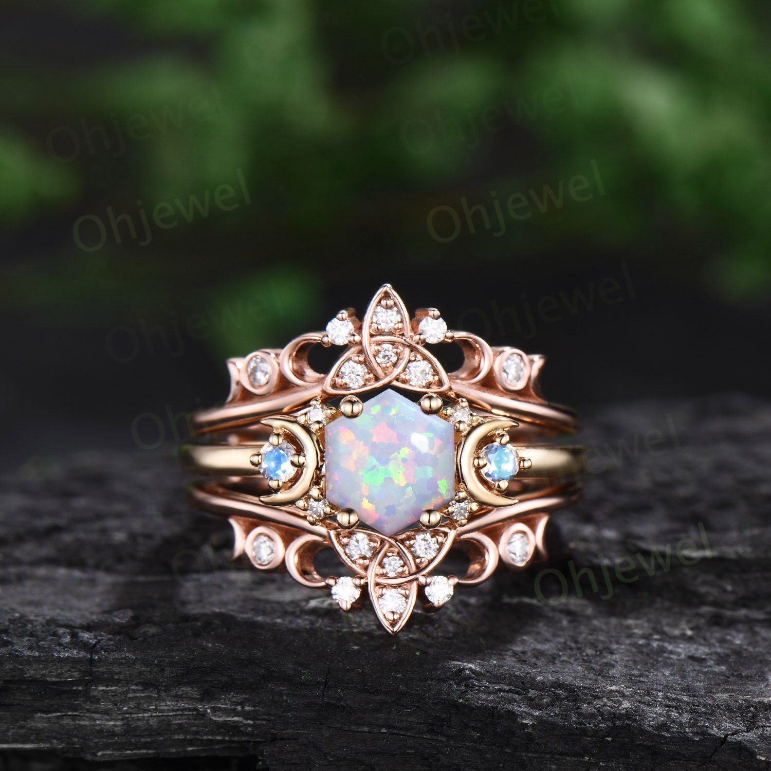 Hexagon white opal engagement ring yellow gold moonstone ring women moissanite Celtic knot moon wedding band enhancer anniversary gift