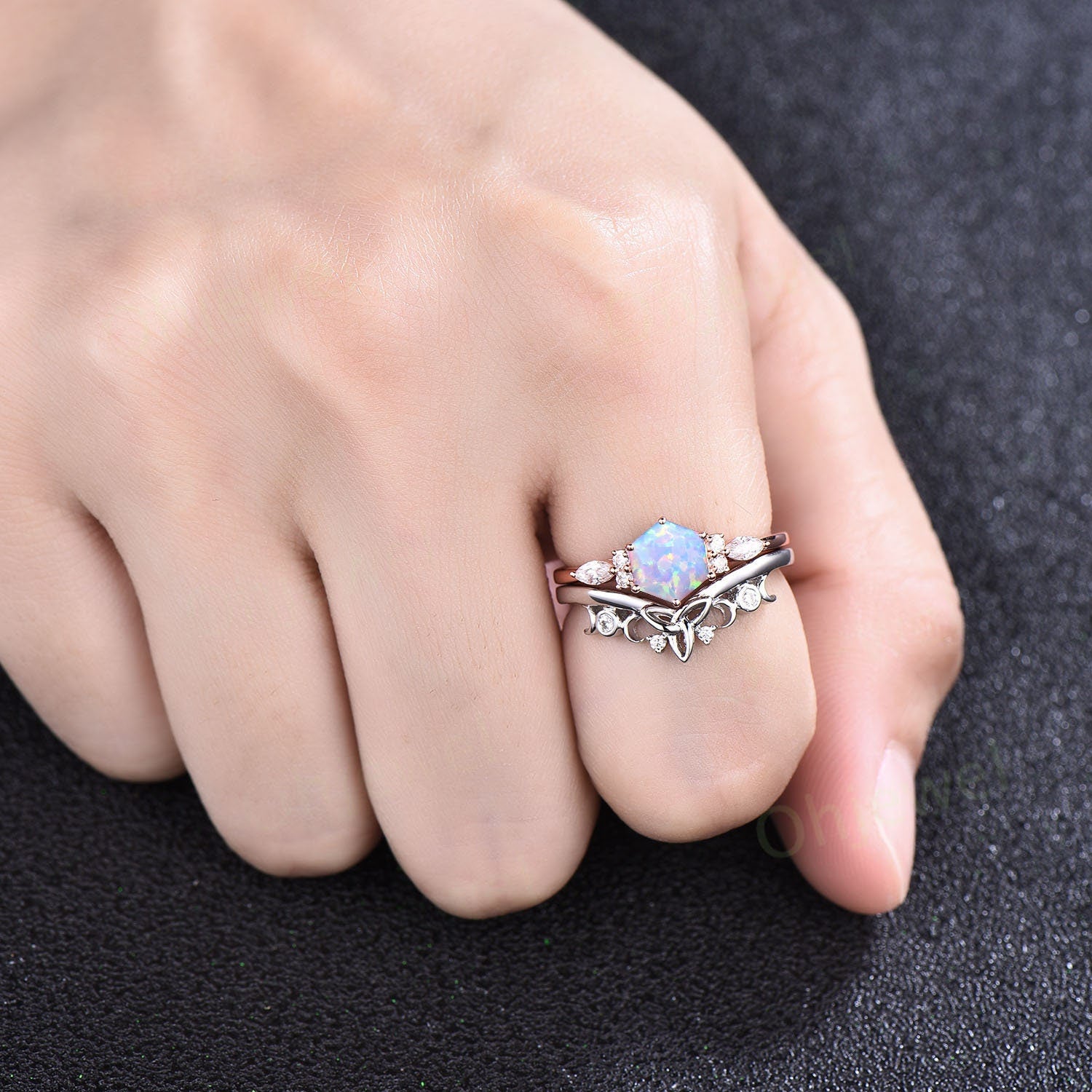 Hexagon white opal ring set gold silver dainty unique opal engagement ring set 6 prong moissanite ring for women October birthstone ring