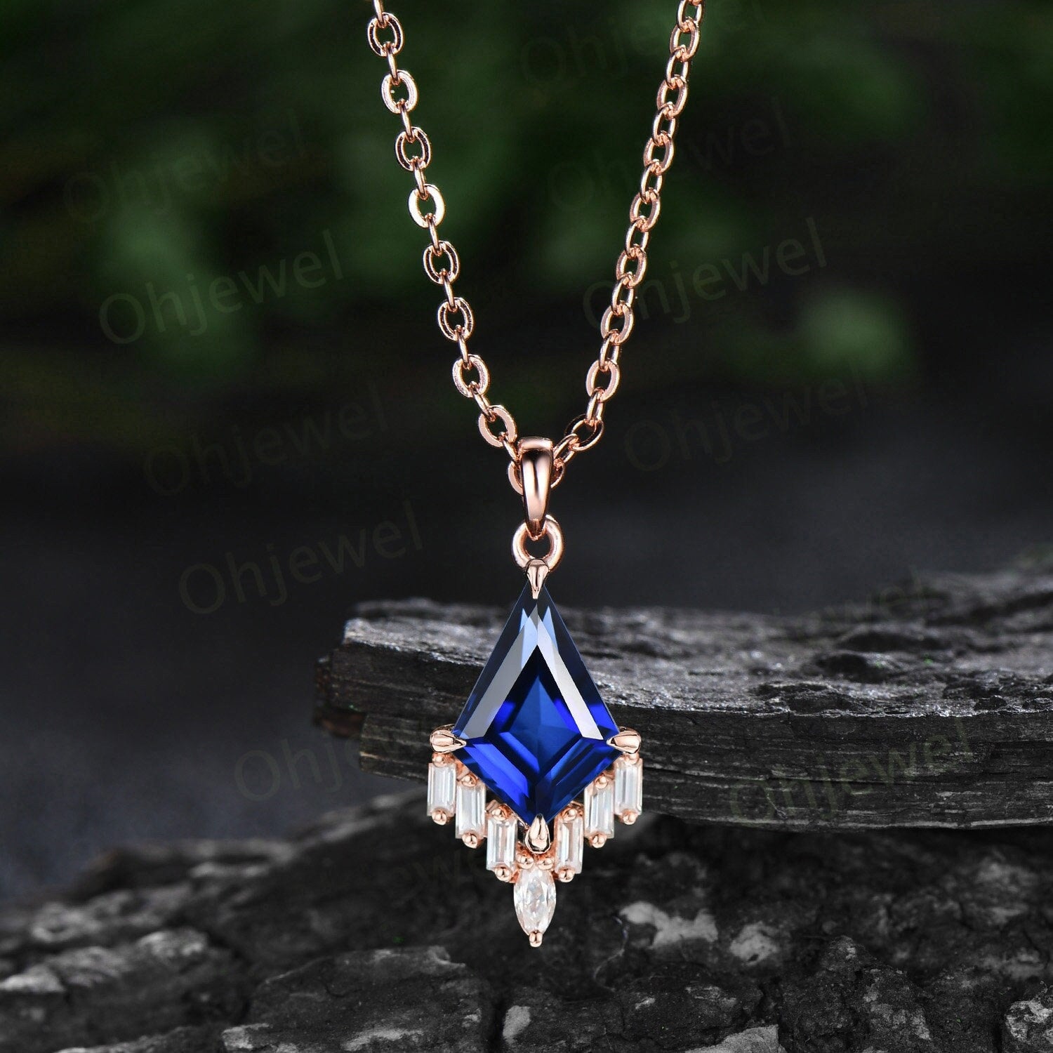 Kite cut blue sapphire necklace 14k rose gold cluster marquise baguette cut moissanite necklace pendant women art deco anniversary gift her