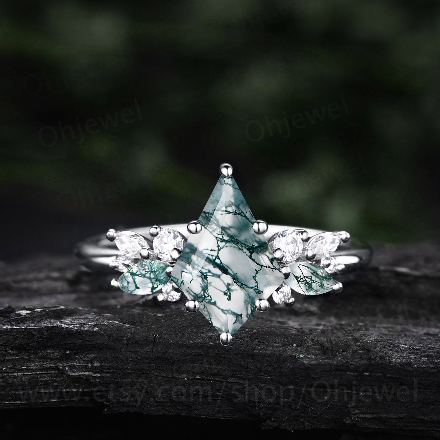 Kite cut moss agate ring gold silver vintage unique engagement ring cluster diamond ring marquise cut moss agate ring wedding ring for women