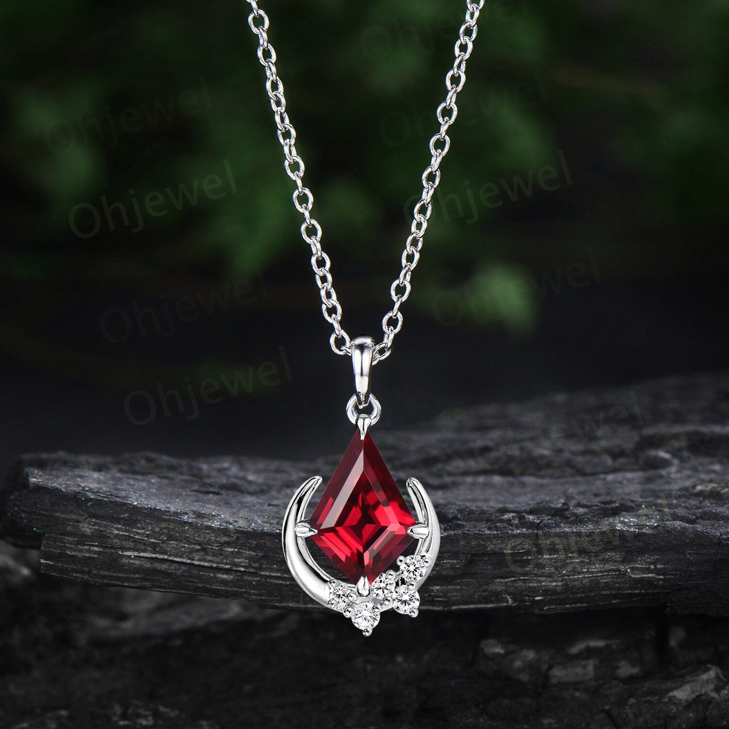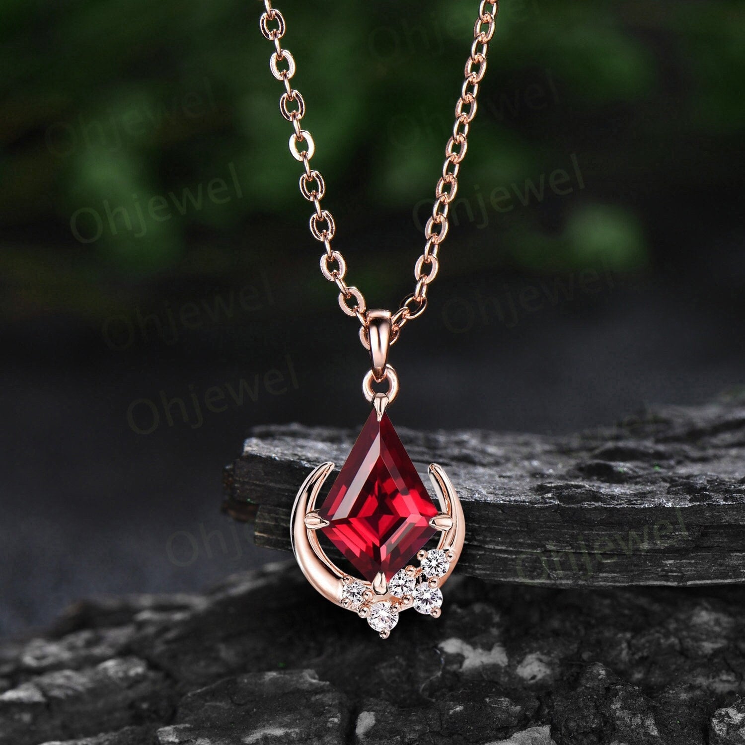 Kite cut red ruby necklace solid 14k rose gold unique moon necklace cluster diamond Pendant women gemstone mother anniversary gift