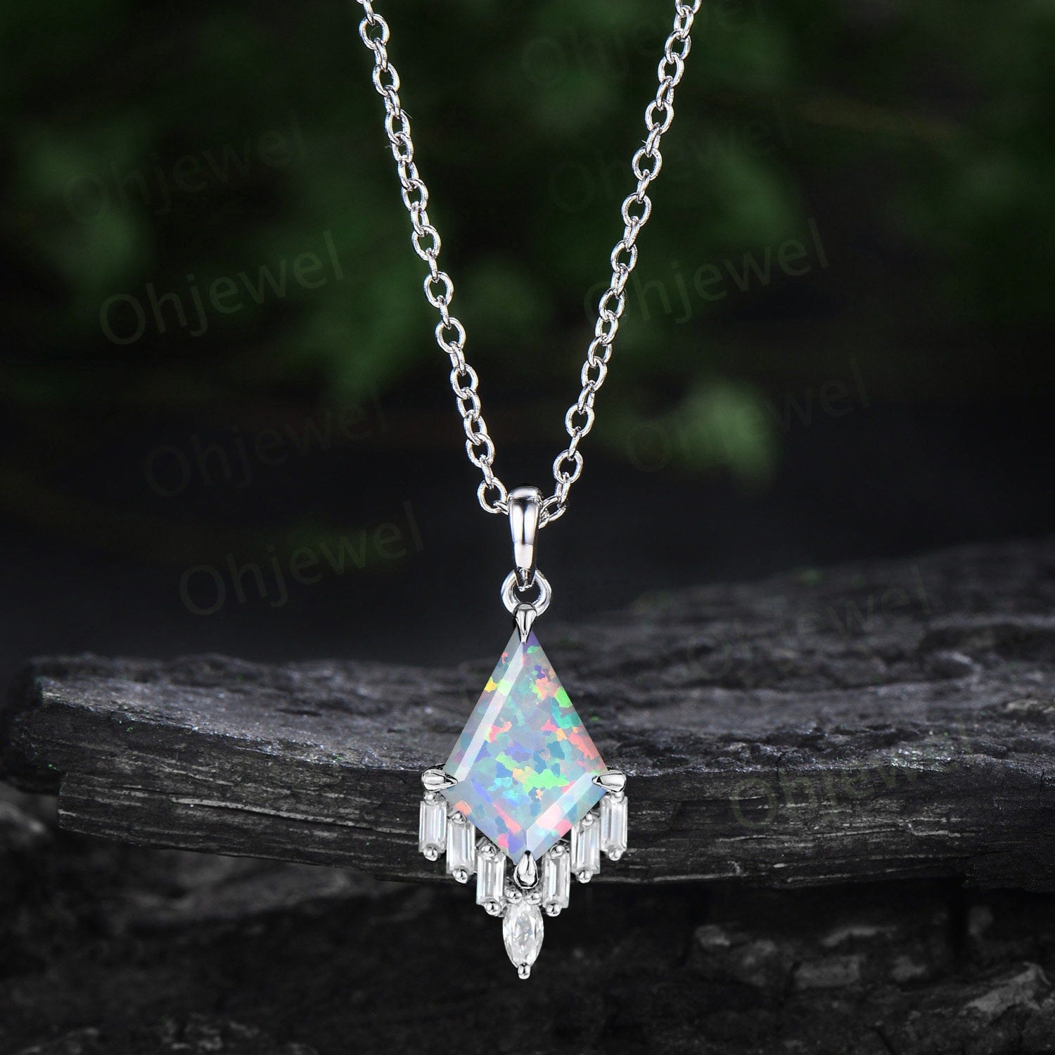 Kite cut white opal necklace 14k rose gold cluster marquise baguette cut moissanite necklace pendant women art deco anniversary gift her