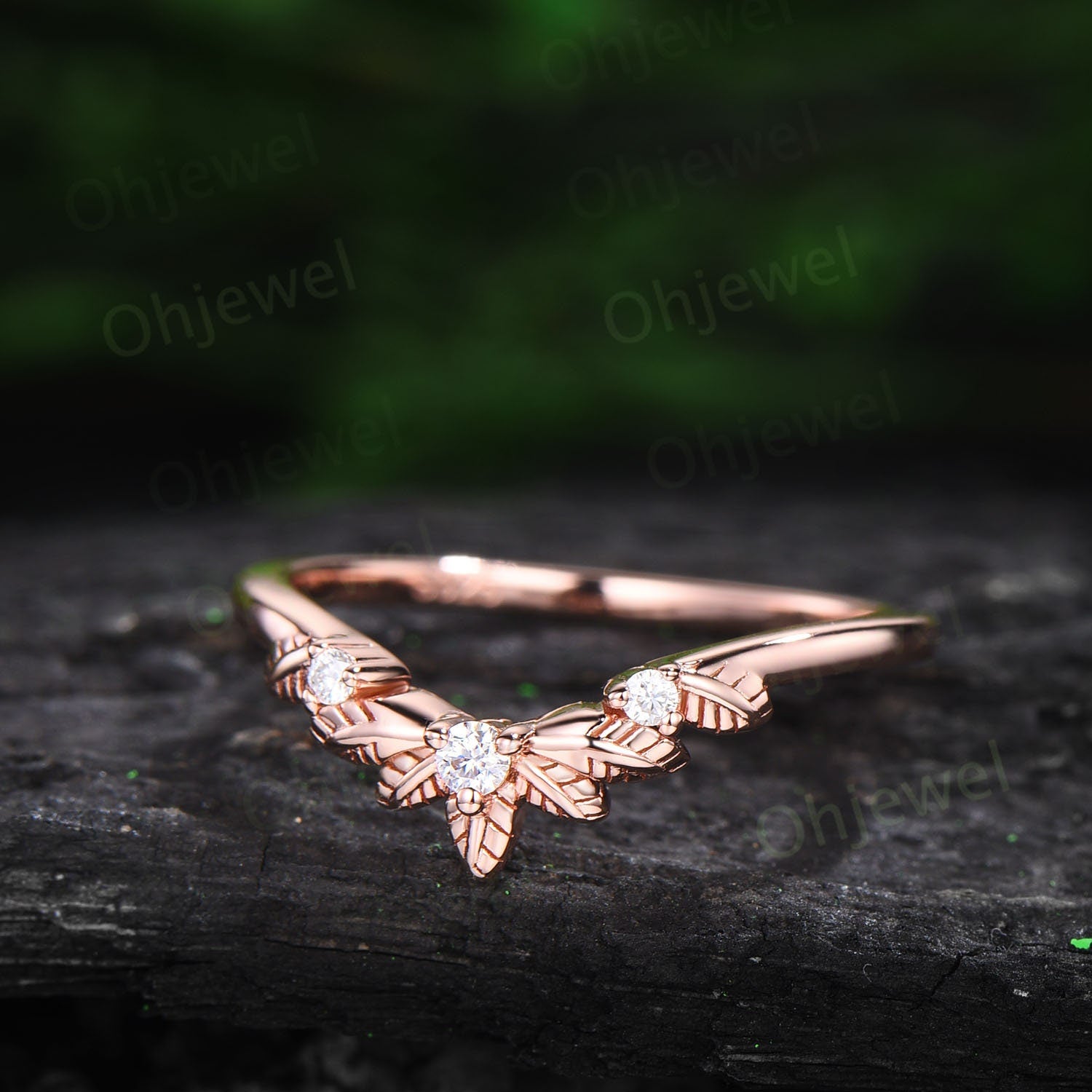 Leaf twig diamond wedding band three stone 14k rose gold ring stacking nature inspired curved moissanite wedding ring band women gift