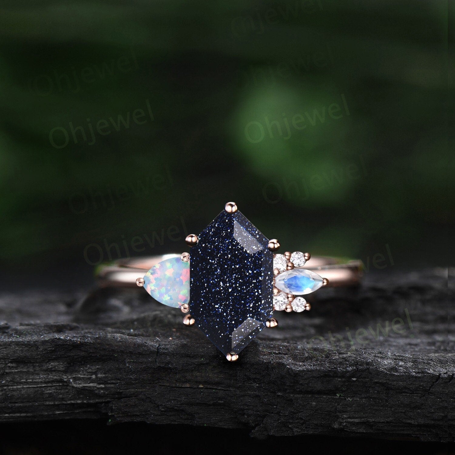 Long hexagon cut blue sandstone ring vintage trillion opal ring women rose gold 6 prong unique engagement ring cluster moonstone bridal ring