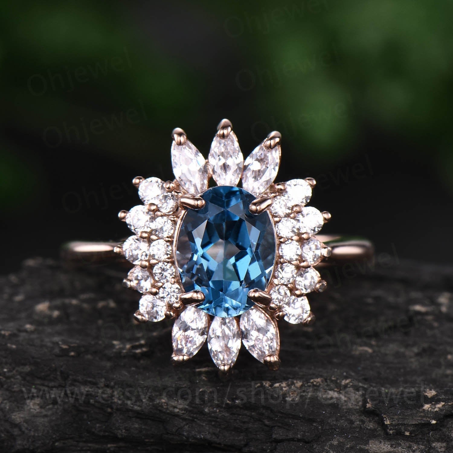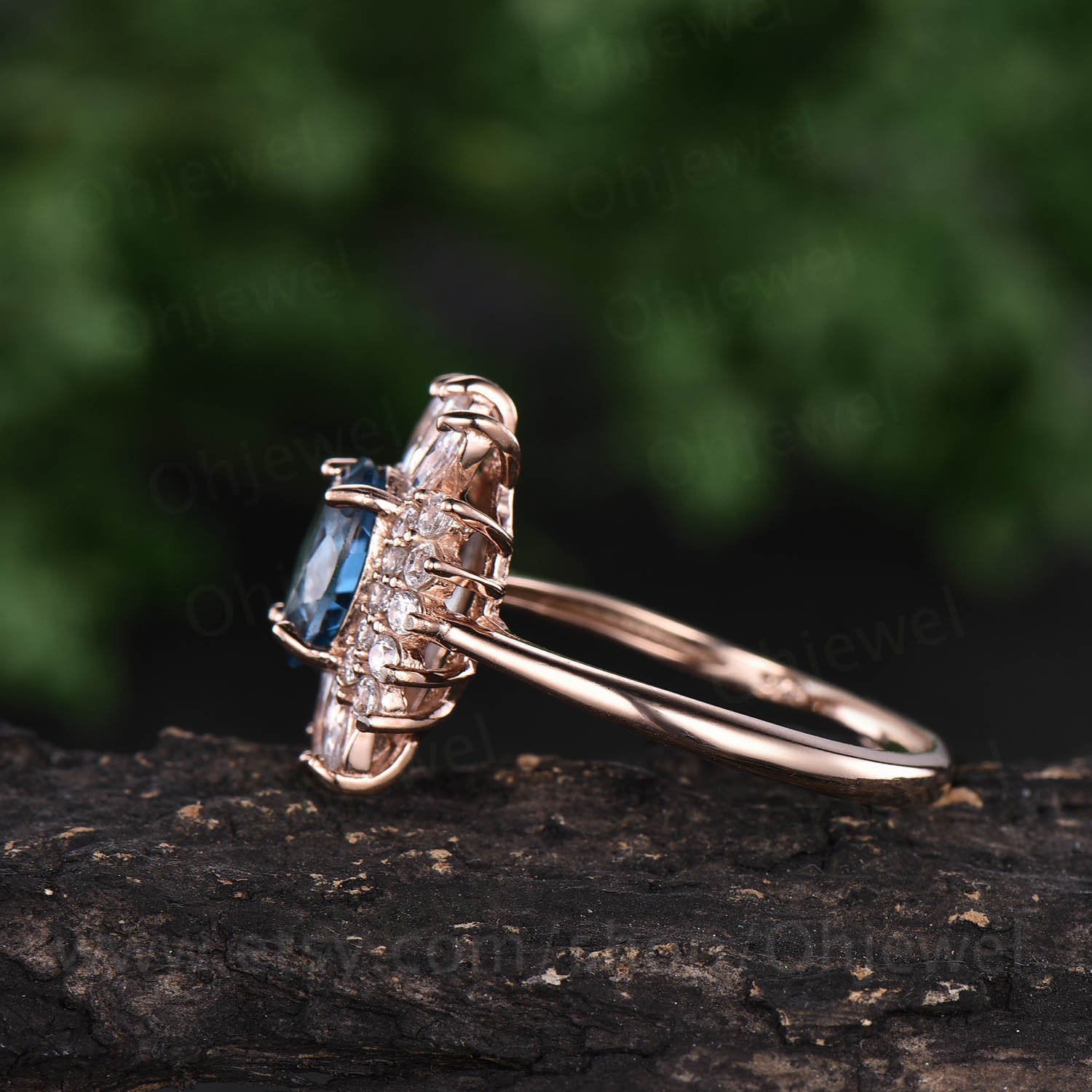 Marquise moissanite ring art deco ring vintage unique halo cluster oval London blue topaz engagement ring rose gold anniversary ring gift