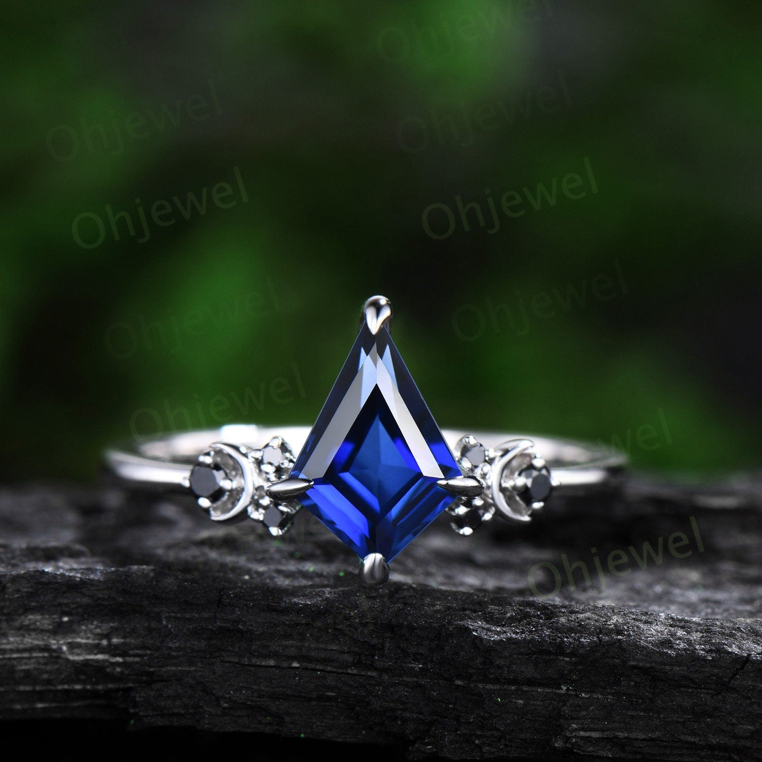 This is a lab blue sapphire engagement ring in solid gold,about 6x9mm kite cut. The accent stones are round black diamonds or black spinels.