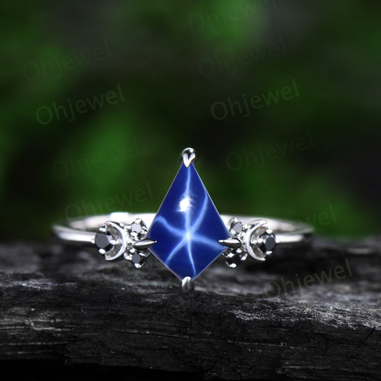Moon black diamond ring vintage kite blue star sapphire engagement ring set 14k white gold retro unique anniversary wedding ring set women