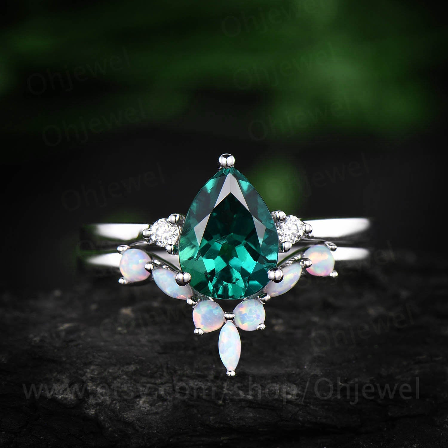 Opal ring curved opal wedding band 2pcs emerald engagement ring set white gold vintage unique ring stacking matching ring custom jewelry