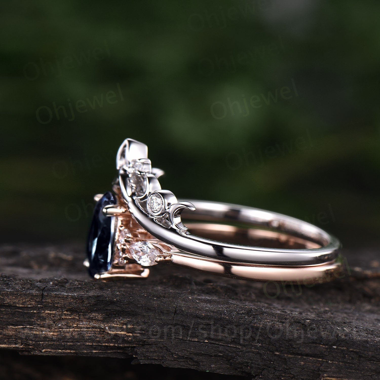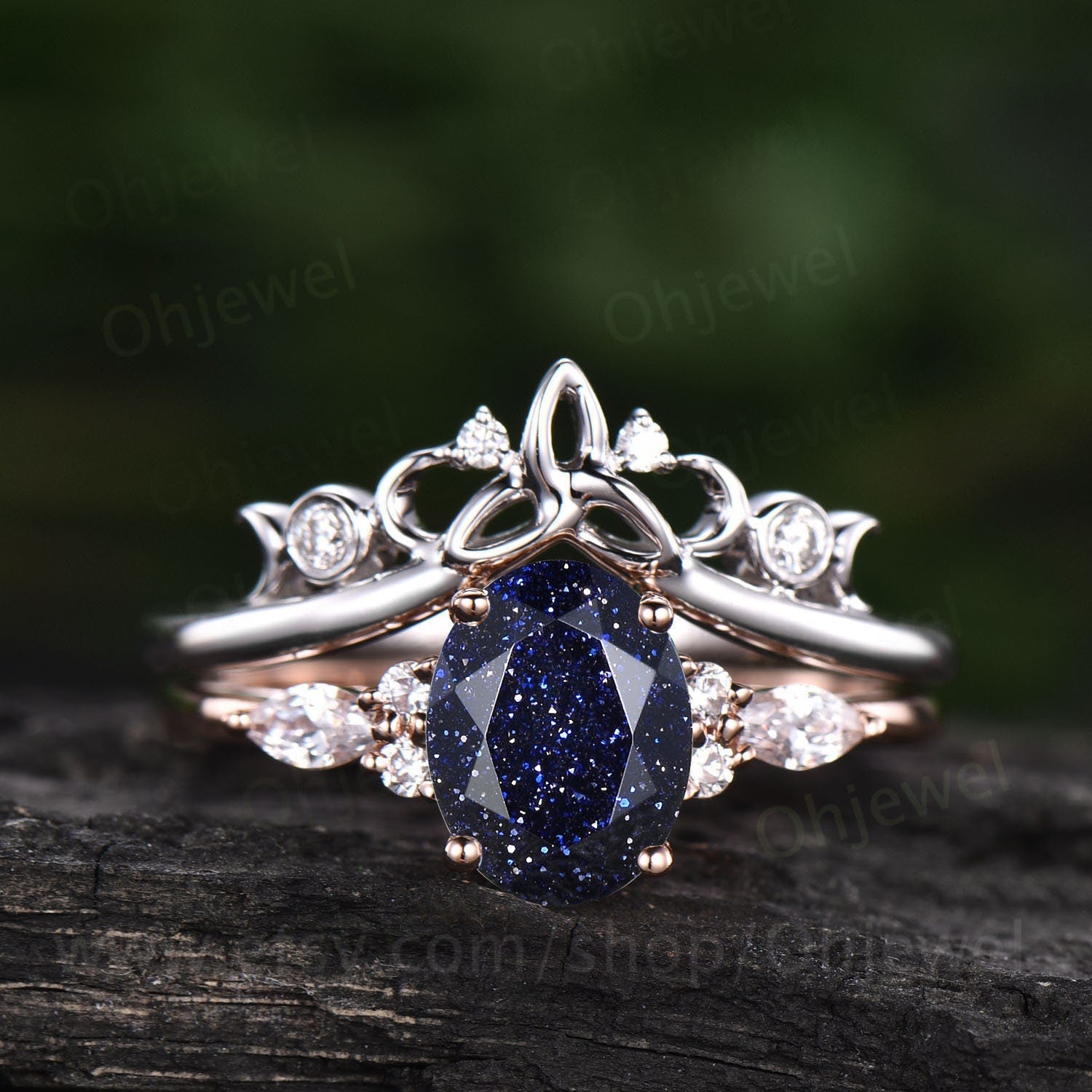 Oval blue sandstone engagement ring set 14k rose gold Galaxy vintage unique engagement ring moissanite ring for women Norse Viking Jewelry