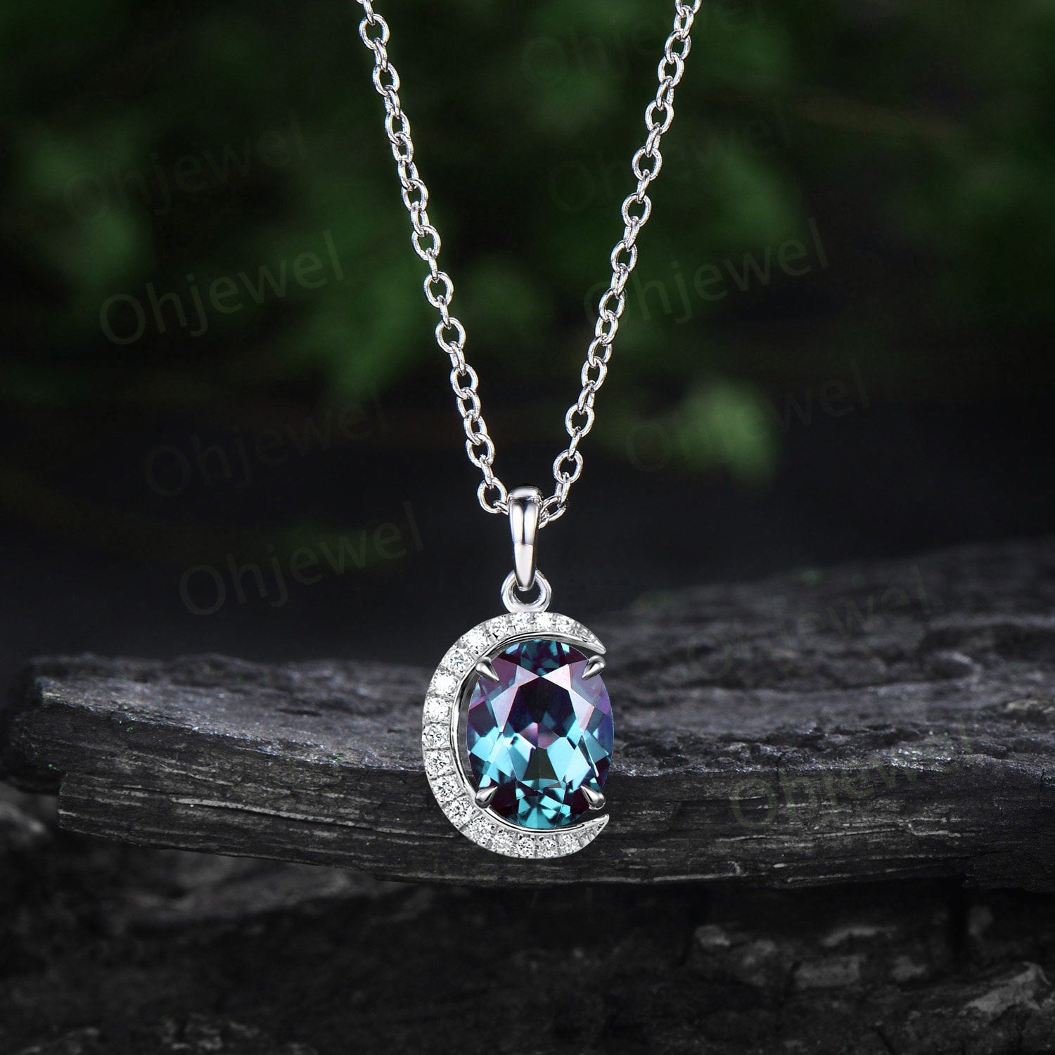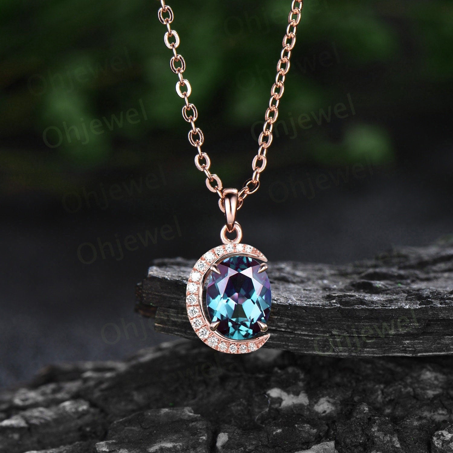 Oval cut alexandrite necklace June birthstone half moon halo diamond antique Pendant rose gold anniversary gift for women