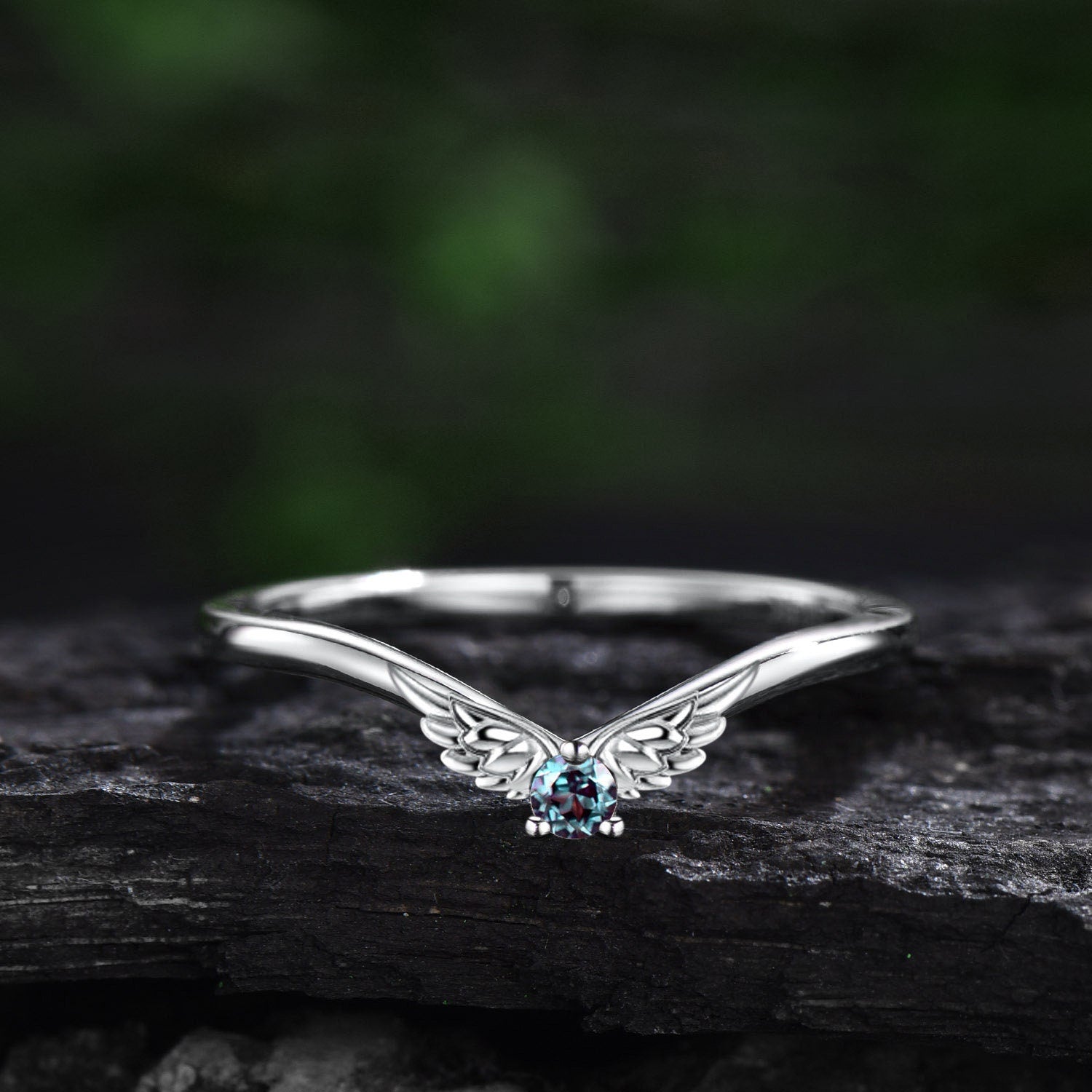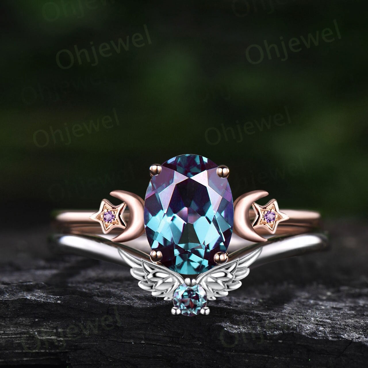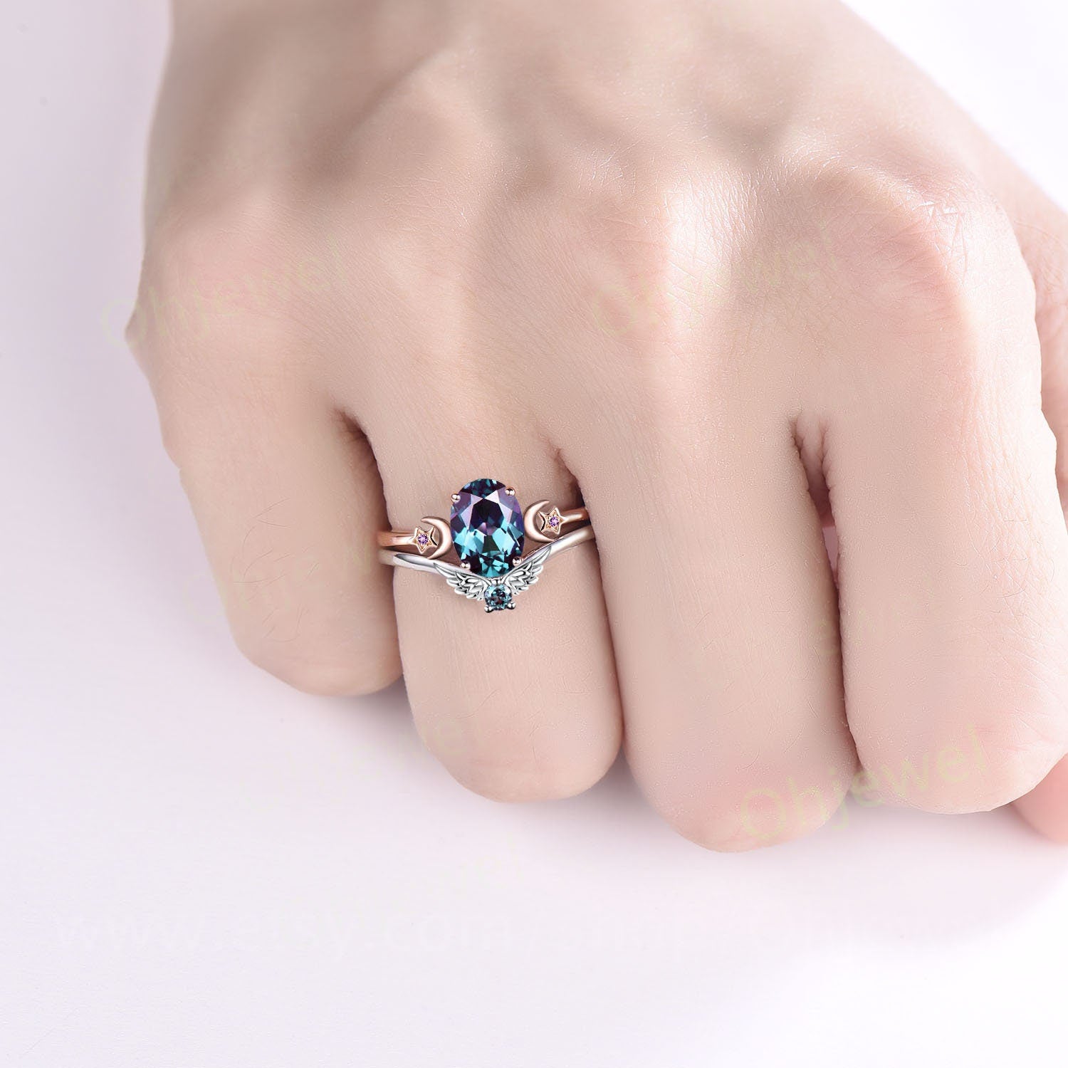 Oval cut Alexandrite ring vintage moon star unique engagement ring rose gold three stone bat wing amethyst ring wedding ring set women gift