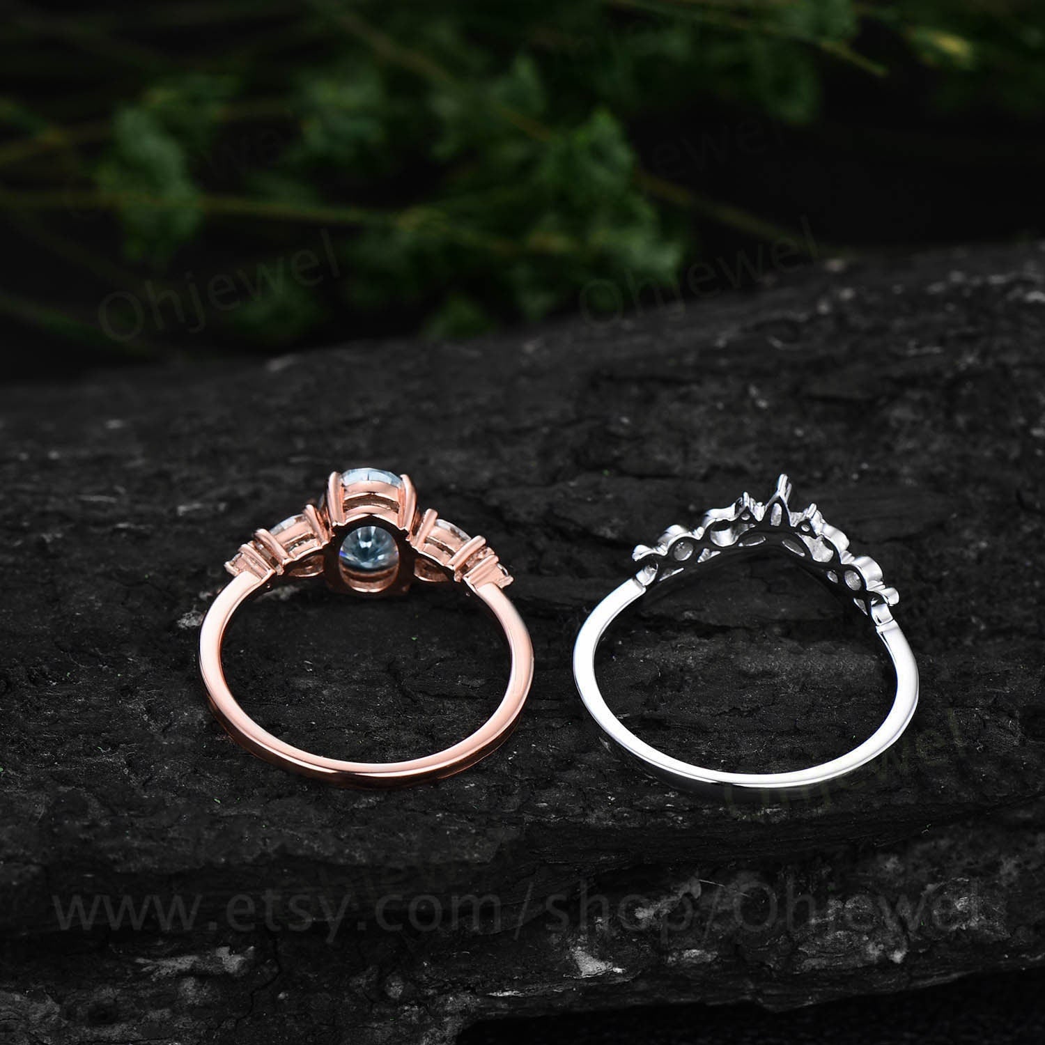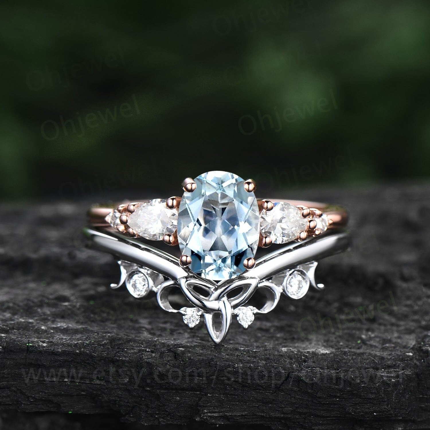 Oval cut aquamarine wedding ring set vintage unique aquamarine engagement ring set gold five stone Minimalist moissanite ring set for women