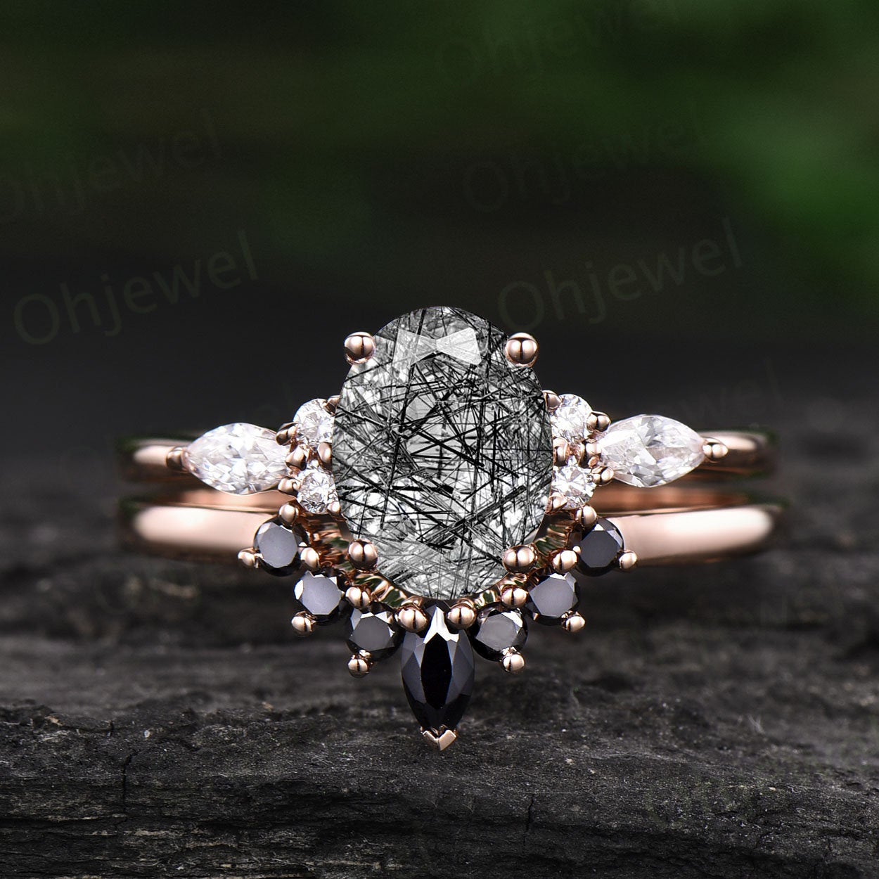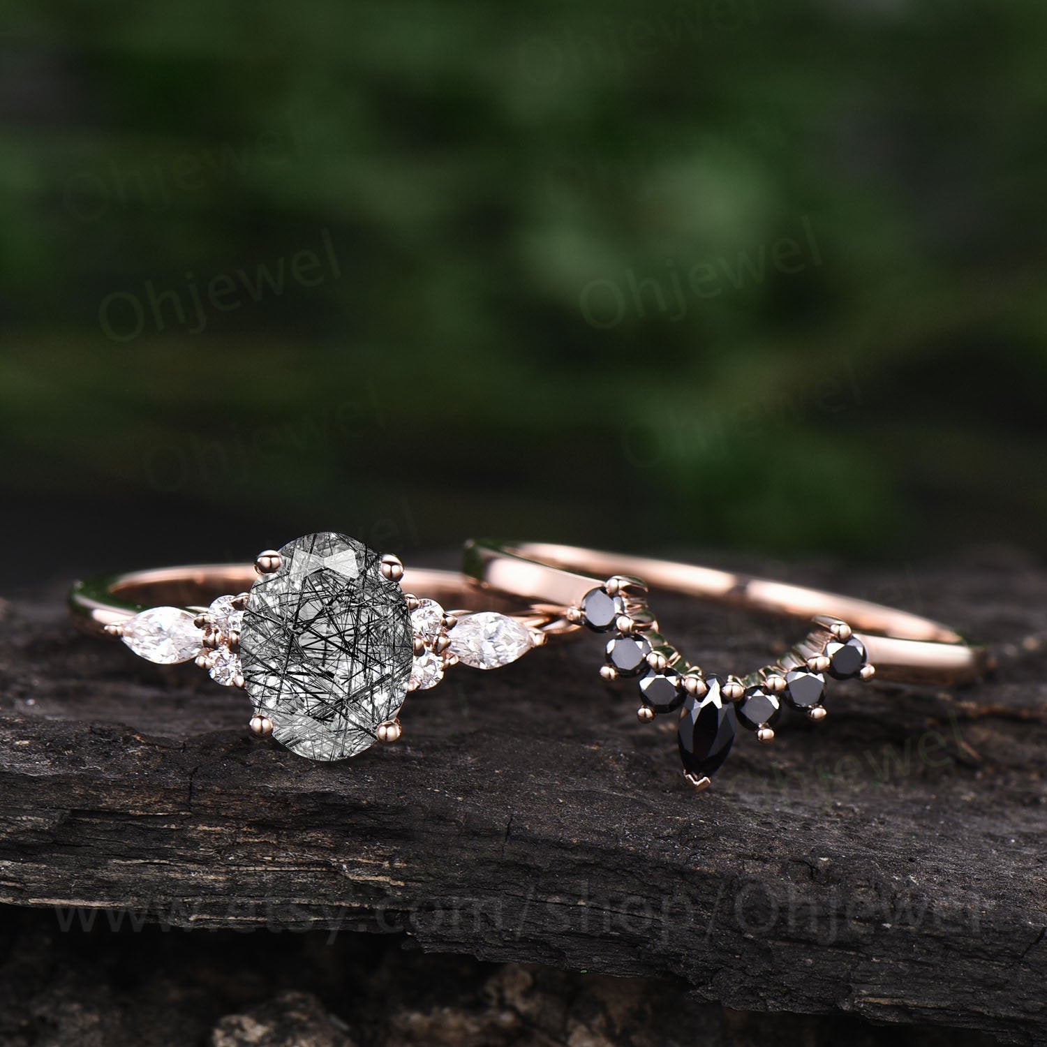 Oval cut black rutilated quartz engagement ring set rose gold ring set black diamond ring set marquise 7 stone ring wedding bridal set gift