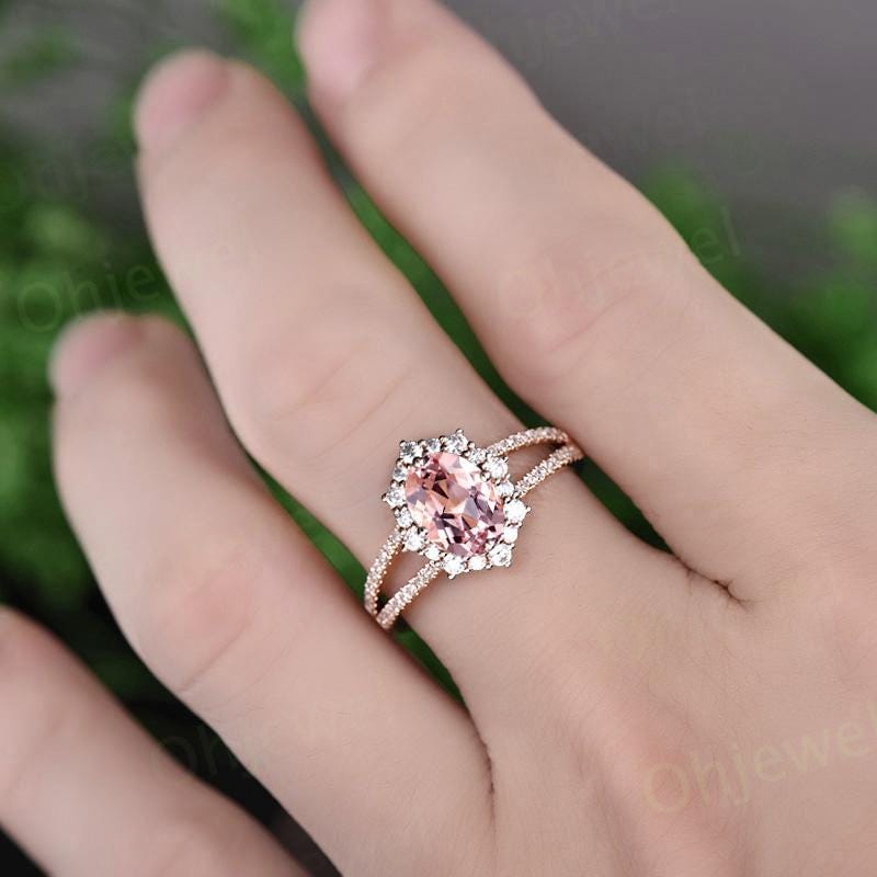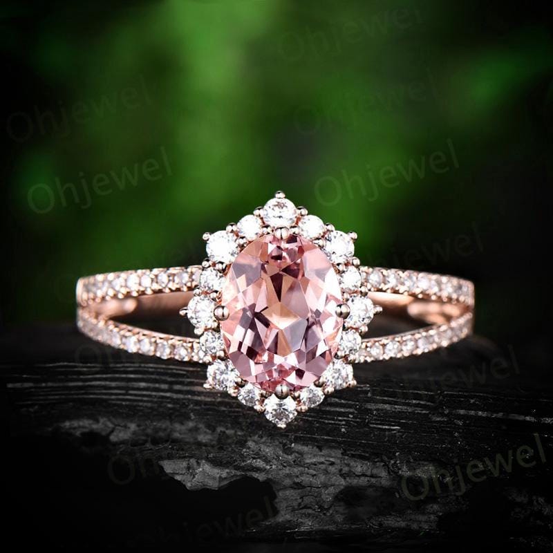 Oval cut morganite engagement ring vintage halo split shank half eternity diamond ring rose gold unique promise bridal ring jewelry gift