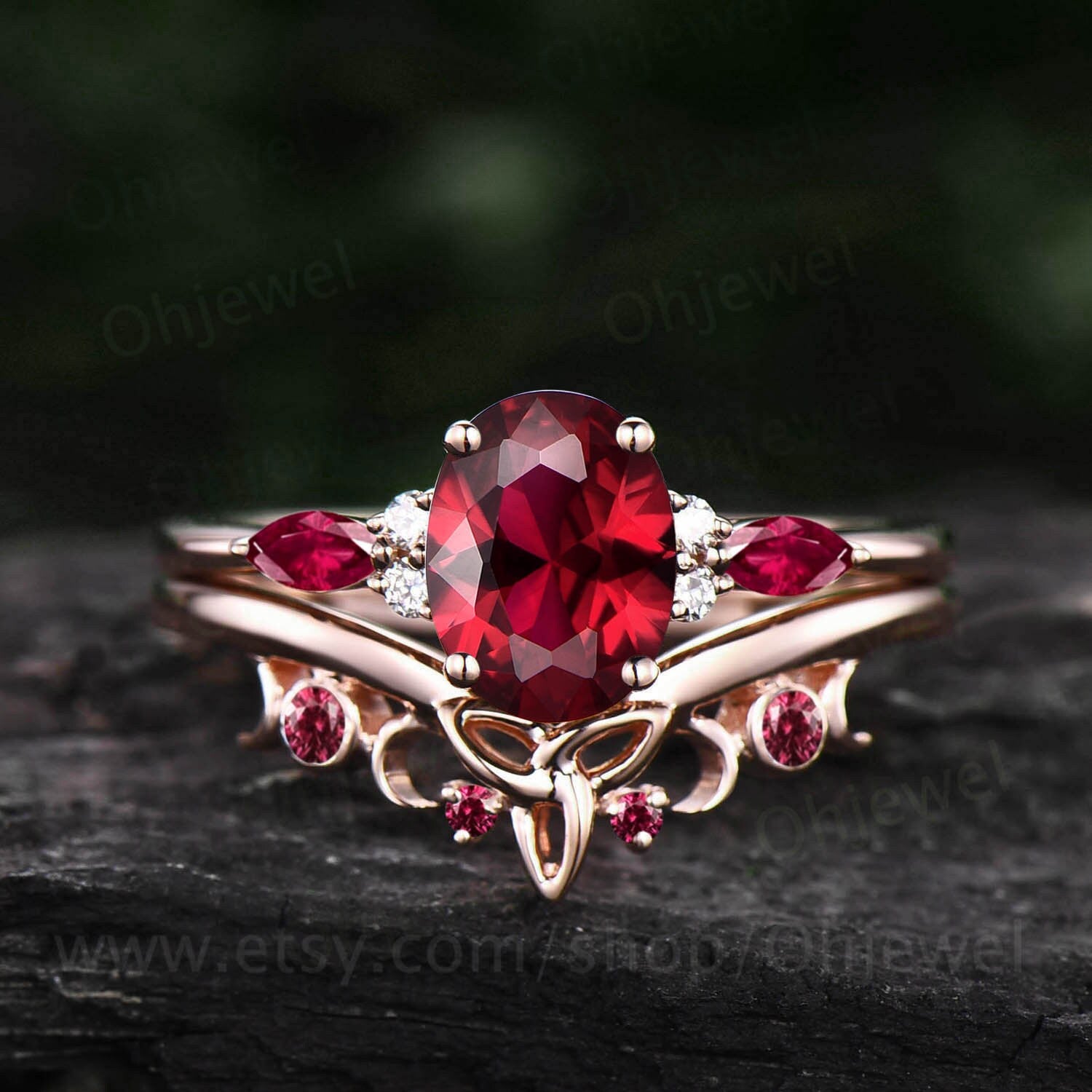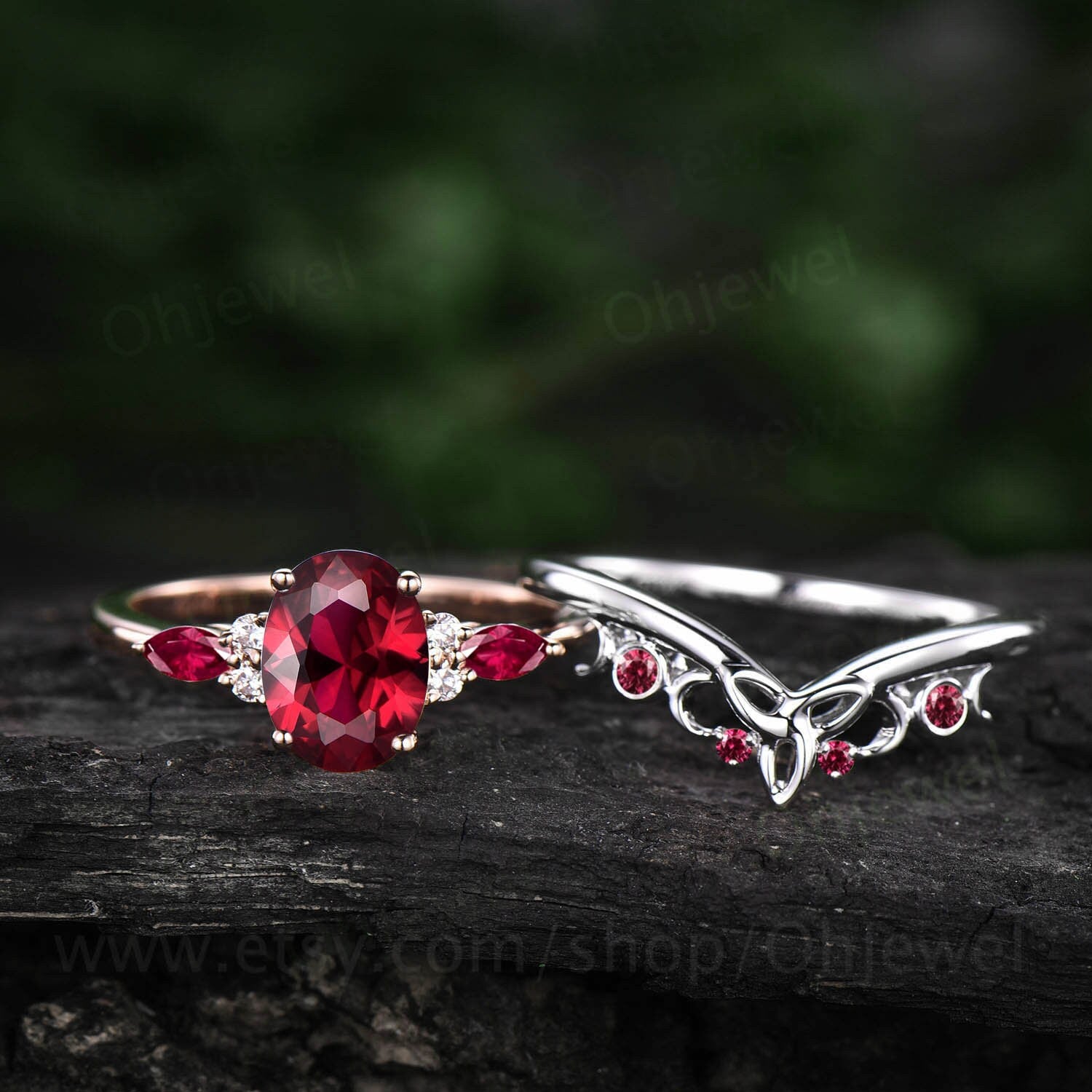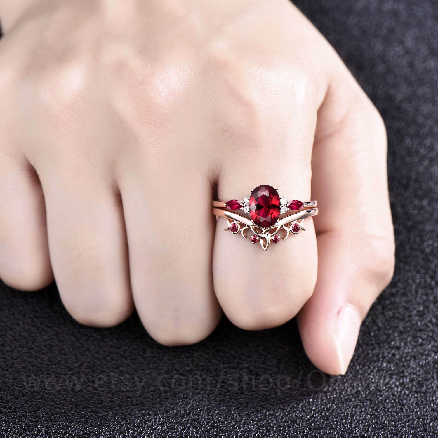 Oval cut red ruby ring vintage unique engagement ring set rose gold cluster marquise cut ruby jewelry anniversary wedding ring women gift