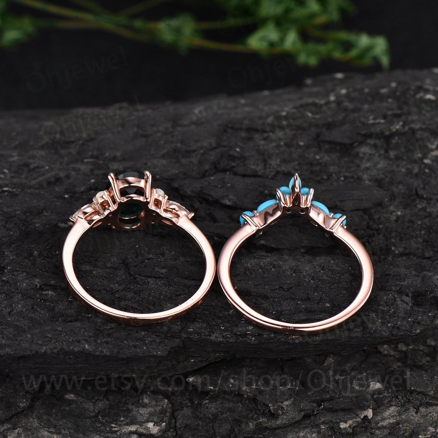 Oval emerald engagement ring set 14k rose gold vinatge opal ring marquise moissanite ring for women turquoise wedding band engagement ring